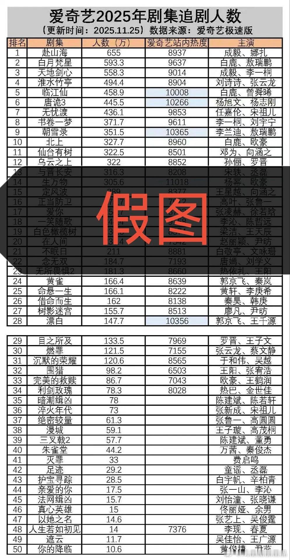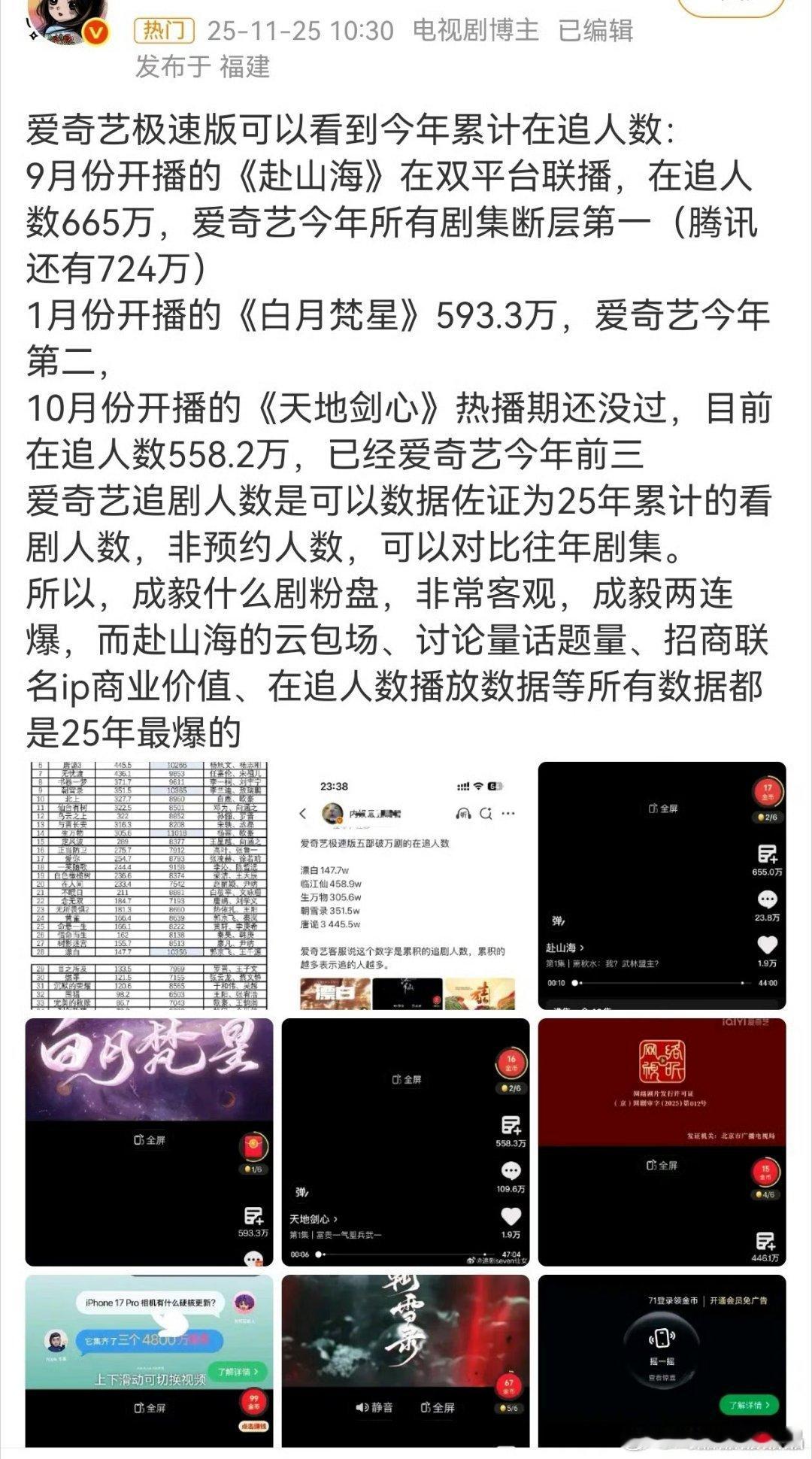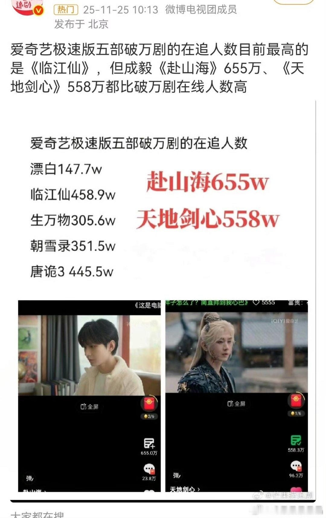 爱奇艺客服回复,极速版app不等于追剧人数,只要有追加按钮就可以点击。昨天好多通稿出来吹白月梵星、临水仙,赴山海、天地剑心在看人数,山海一部双平台云合2500+,天地一部爱奇艺单平台1000+是公认的扑街剧。粉丝做假表明晃晃的到处发通稿不觉得可笑吗?再看狂飙才25万,直接破了这张粉丝假表