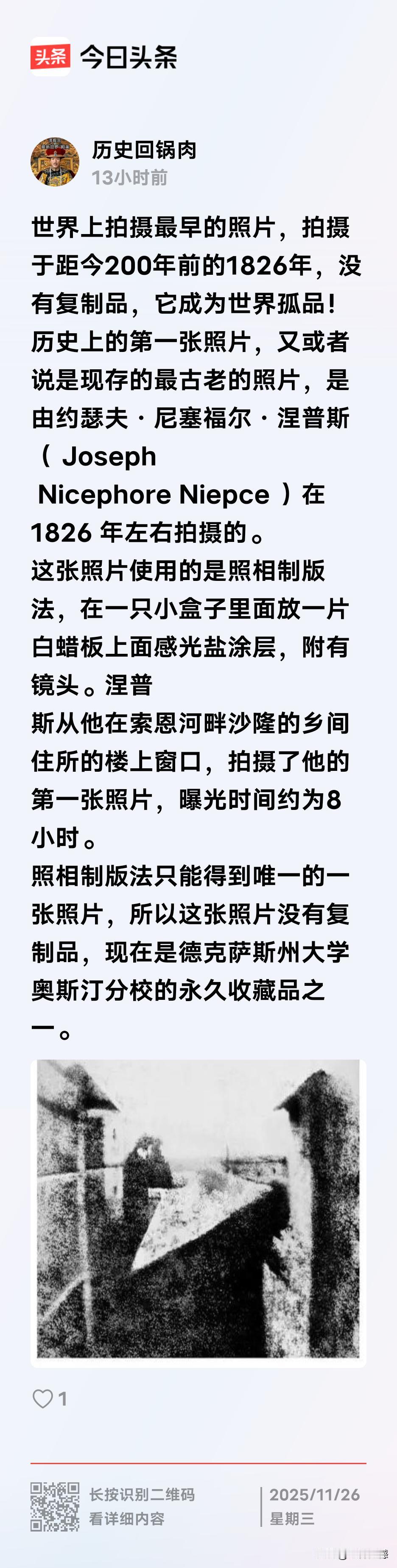 世界上第一张照片,拍摄于1826年,距今已经199年了,当时拍摄的照片非常的模糊,只能看出所拍景物的大致轮廓,当时的人说啥也想不到,现在的照相技术已经发展到何种程度,不到200年的时间,日新月异,天翻地覆,这就是科技的力量!
