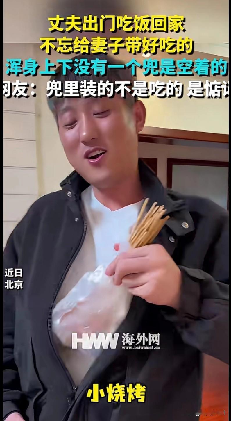 北京大哥这波操作,把“宠妻”焊在身上了! 谁懂啊!北京一哥们儿出门聚餐,回家愣是把自己变成“移动零食袋”——外套兜、内兜、连夹克拉链缝里都塞着给老婆带的小烧烤! 视频里他一进门就开始掏:“这是你爱吃的烤面筋”“还有脆骨串没凉!” 浑身上下没个空兜,连手里都攥着签子。网友笑疯:“这哪是装吃的,是把‘惦记’揣满了啊!” 咱就是说,浪漫不一定是钻石玫瑰,是吃饭时扒拉着烤串想“我媳妇儿爱吃这个”,是宁愿自己兜揣得硌得慌,也得把热乎的往家带。 这波“揣兜式宠妻”,直接把普通日子过成了糖罐子!谁看了不喊一句:“给我来一沓这样的老公!”