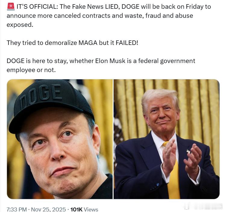 假新闻又撒谎了,DOGE将于周五回归,公布更多被取消的合同,以及曝光的浪费、欺诈和滥用行为。他们试图打击MAGA的士气,但不会成功!无论埃隆·马斯克是否是联邦政府雇员,DOGE都将长期存在。