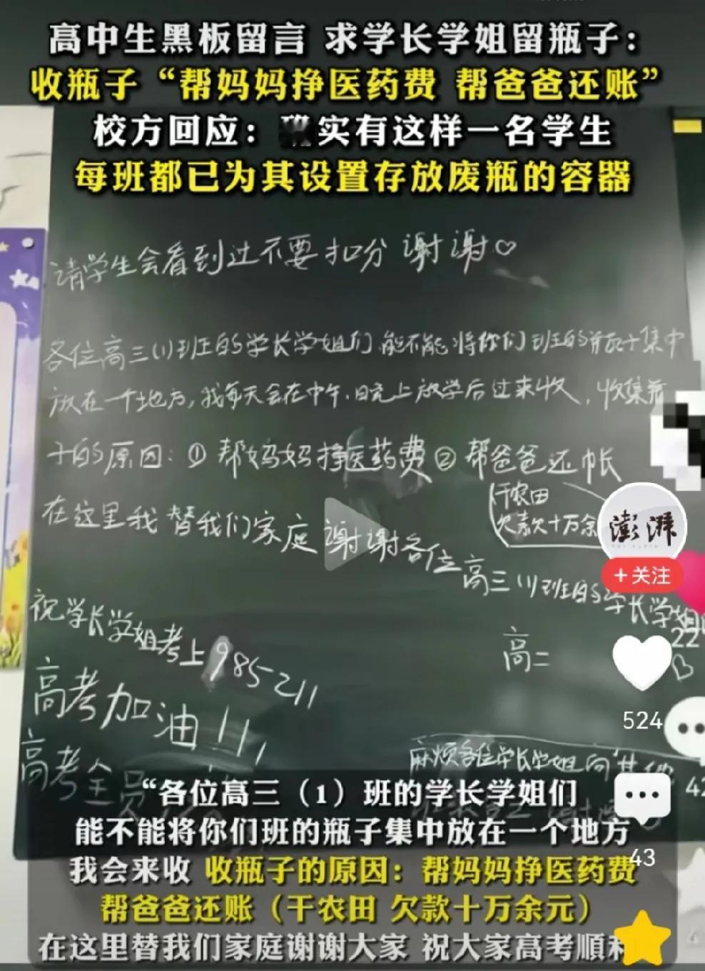 多懂事的孩子!一名高中生的黑板留言,要求学长们为他保留废瓶子,说到原因让人泪目! 近日,安徽的一名高二学生,在小黑板留言,要求高三一班的学长们为他保留废瓶子。 从留言可以看出,他非常需要这些瓶子来解家里的燃眉之急。 1.要求大家把瓶子放到一个地方,他会趁放学时段取走。 2.妈妈生病了,给妈妈挣医药费。 3.帮爸爸还账,因为爸爸种庄稼欠了10万块。 不得不说,这个孩子真的太懂事了,也很聪明: 1.作为高中生,他能够直面生活中的困难,努力去解决问题,并不觉得捡废旧瓶子是件丢人的事。 2.很聪明,并大方的在小黑板上表达自己的诉求,寻求学长们的帮助,并送给了高三学哥学姐们美好的祝愿。 幸运的是,学校知道了孩子的情况,每个班级都为他在固定地方保留了瓶子,这样他就有更多的瓶子可以捡到了。 说实话,青春期的孩子正是自尊心最强的时候。 他没有怨天尤人,没有装可怜卖惨,敢于拉下面子,直面困难,并想办法解决问题,这孩子将来一定不会差的。 这个孩子虽然家庭贫困,但他有不屈不挠的信念,相信他们家的生活一定会苦尽甘来!