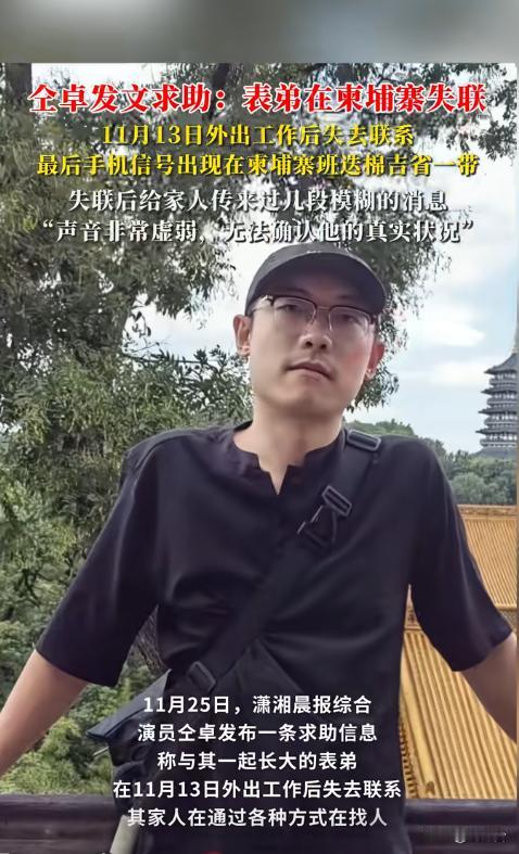 仝卓紧急求助!表弟柬埔寨失联13天,最后定位在电诈园区附近🙏 “求大家帮忙转发!我从小一起长大的弟弟失联13天了,他妈妈快扛不住了……”11月25日晚,演员仝卓的一条求助微博瞬间引发全网关注,失联的正是他的表弟李怡亨,而最后的消息指向了柬埔寨的电诈高危区域。 30岁的李怡亨原本在上海做安保工作,日子平淡安稳。11月8日,他告诉家人接了个南宁展会的临时工作,9日抵达南宁后还每天报平安,可13日中午突然手机关机,彻底失去联系⚠️。 家人急疯了,通过手机定位查到他最后的信号出现在柬埔寨班迭棉吉省——这个区域早已因聚集大量电诈园区而“臭名昭著”。更让人揪心的是,15日家人接到一个外国虚拟号来电,电话里李怡亨声音虚弱地报平安,却有陌生男子在旁指挥他向家里要钱,所幸家属未贸然转账。 “听到孩子说‘我想回家’的那一刻,我的心都碎了。”作为单亲妈妈,李怡亨的母亲每天以泪洗面,在社交账号@单亲妈妈柬埔寨救子 里写下求助心声:“我不敢奢求太多,只希望儿子能活着回来,哪怕只是让我知道他还平安。” 仝卓得知消息后第一时间发声,不仅转发求助信息,还在评论区回应网友确认“是我表弟”,恳请大家帮忙扩散。好消息是,事件已引起官方关注——11月26日,中国驻柬埔寨大使馆正式通报,称已立即联系柬警方核实情况,将全程密切跟进,全力维护中国公民安全✅。 目前李怡亨失联已超13天,家人既担心他的人身安全,又对他如何出境满心疑惑:“他从没提过去柬埔寨,根本不确定是不是被诱骗偷渡的。”这也给所有人敲响警钟:陌生的“高薪临时工作”可能藏着陷阱,出境信息一定要及时告知家人。 每一次转发都可能为救援增加一份希望,希望在柬同胞和相关机构能提供线索,更盼驻柬使馆的介入能带来突破性进展。愿李怡亨能平安脱险,早日回到母亲身边❤️。 仝卓表弟柬埔寨失联 驻柬使馆介入救同胞 警惕境外电诈陷阱