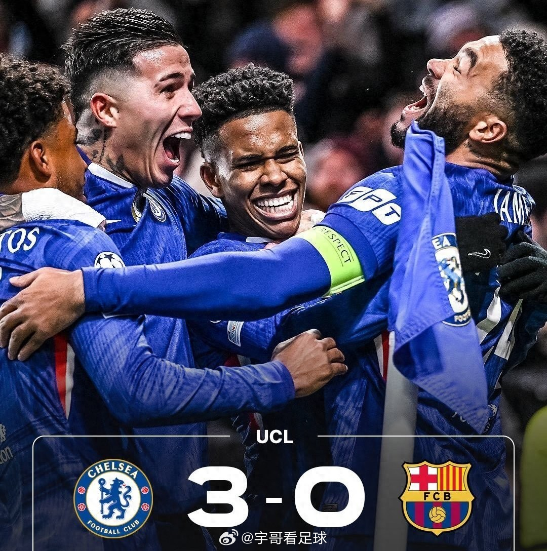 11月26日4点,25-26赛季欧冠第5轮,切尔西主场3-0完胜巴塞罗那。第44分钟巴萨阿劳霍两黄变一红离场,蓝军3次破门因手球、越位等被判无效。18岁巴西天才埃斯特旺连续3场欧冠进球,孔德自摆乌龙、德拉普建功。切尔西6场不败积10分,巴萨终结53场进球纪录积7分。