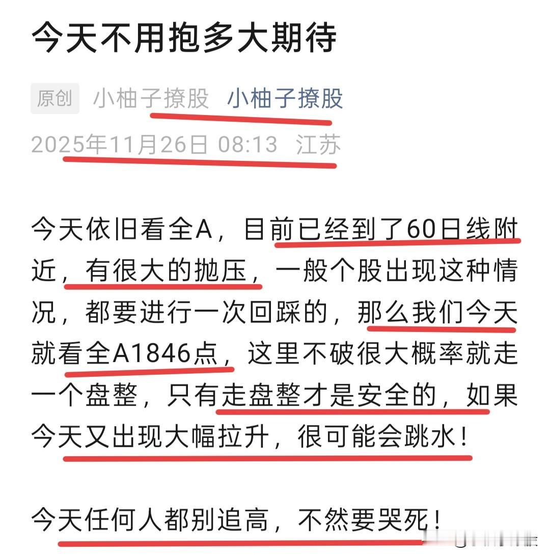 今天全A必须要在1846.7点上方震荡,不能在拉升,只要下午一拉,明天上涨的预期就不存在了! 所以只需要看好这个点位,破掉也没预期,拉升也没预期,只有在这上方窄幅震荡还存有预期! 关了我两天,我也不会写了,以前都是提笔如泉涌,现在打开头条不知道写啥…… 就按早上写的思路应对吧