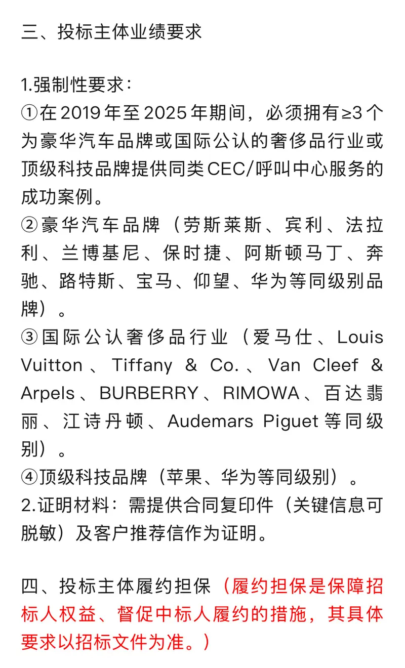 车若初见 长城超豪车BG新动作,打算招标一套完整的客户互动中心外包服务,强制性要求在2019年到2025年期间,有3个顶级品牌的成功案例,汽车是劳斯莱斯、法拉利级,奢侈品是爱马仕、LV级。长城超豪BG品牌首款车,对标法拉利,V8+混动,魏总亲自督战,买了劳斯和法拉利拆解,新车2026年底推出,屏幕前的老板们再等等哈。