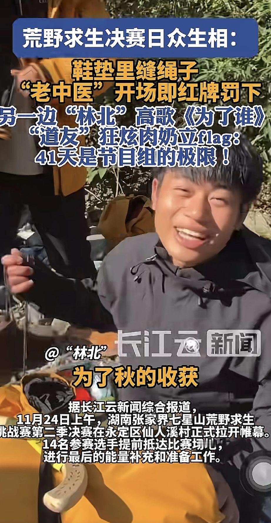 好家伙,这场荒野求生决赛简直比电视剧还精彩! 选手们为了夺冠各显神通:有人在鞋垫里缝绳子被查,开场就被红牌罚下。最绝的是林北选手,居然在深山老林里高歌《为了谁》,这心态也太稳了! 看着选手道友炫肉和牛奶补充蛋白质,还立Flag说41天是节目组的极限,不是他的极限。这哪是比赛,分明是意志力的终极考验。