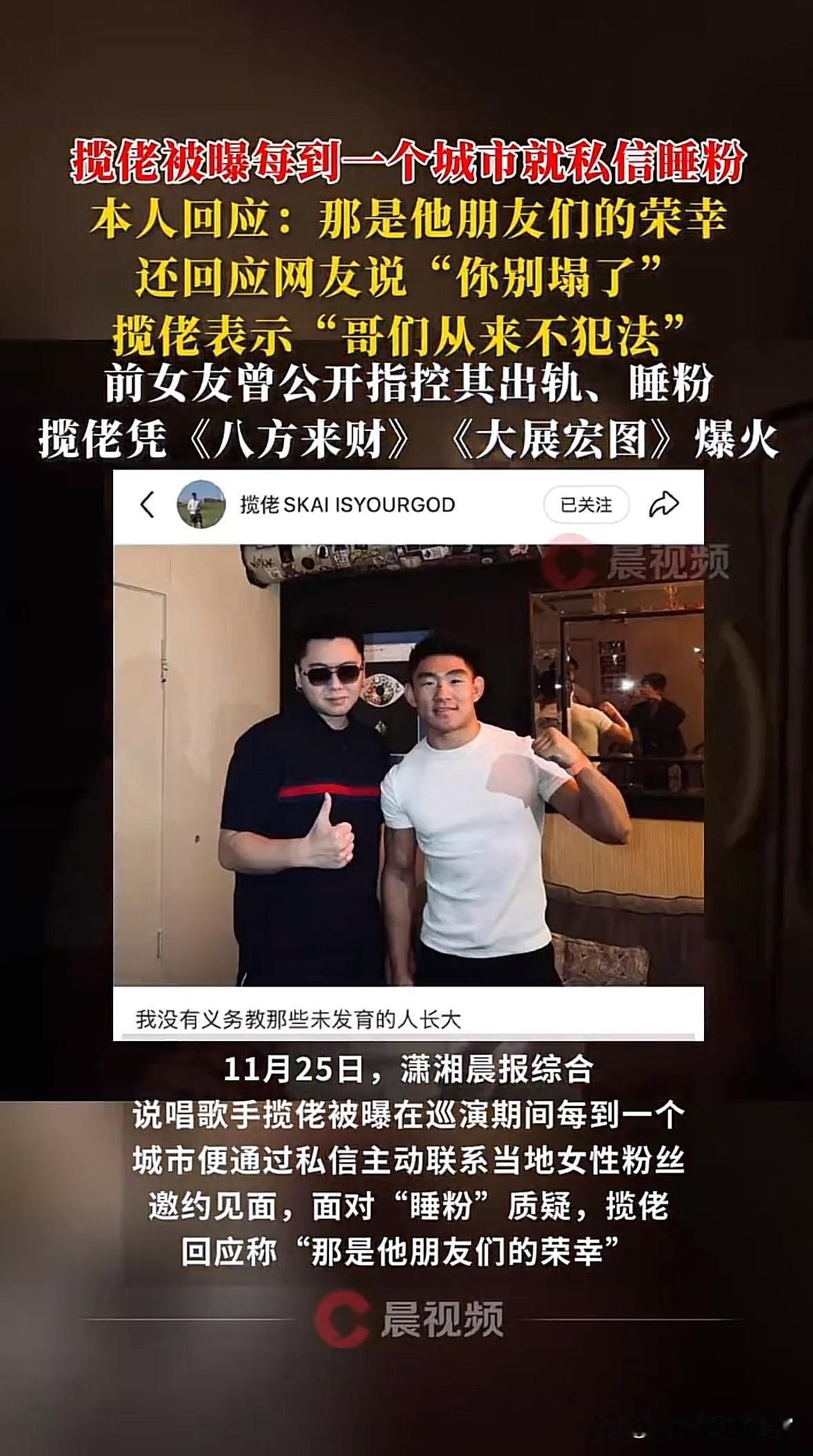 “被睡”是粉丝的荣幸?明目张胆乱的这么牛掰的堪称第一人 不管是演艺圈还是网红圈,都像是一个大染缸,什么人都有。虽然没办法拿到台面上聊,但大家都保持着面子上的体面。 一首“八方来财”口水歌,捧红了一个所谓的说唱歌手。不谈什么词曲素养,佩服这人的运气。你红就红你的呗,面子上的功夫做足就好。近日网上爆出该歌手每到一个城市,就在粉丝里挑选私信,来个彻夜长谈,兴趣所致,还要多人狂欢。 被爆出该事件后,该歌手称“被睡”是粉丝们的荣幸。什么时候网红已经自我膨胀到这个地步了?别人是一曲成名,现在一曲称帝了?私下自己怎么疯狂没人管你,那是隐私。都被爆出来了都这么理直气壮,俩个字“真牛掰”!睡粉事件