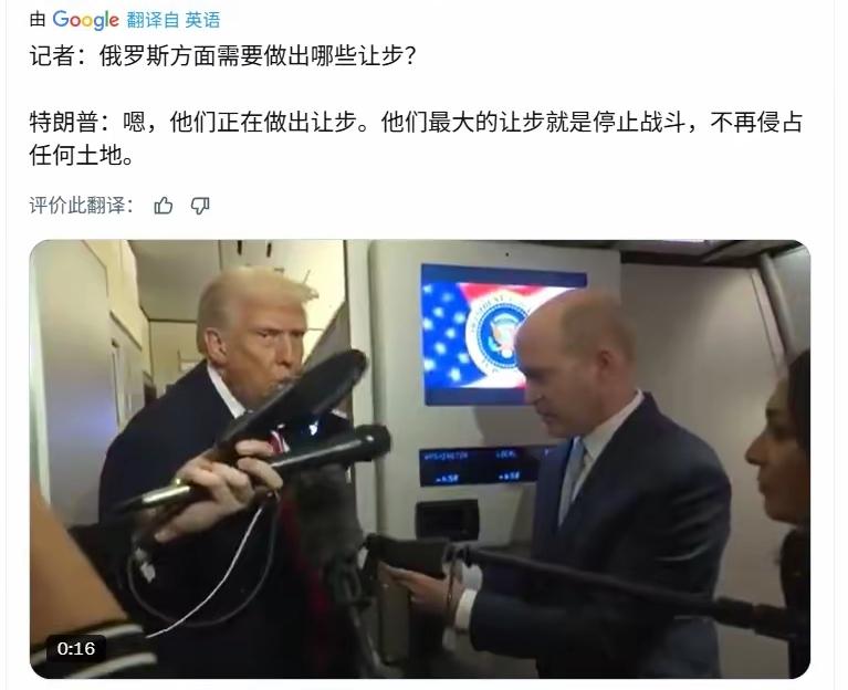 记者:俄罗斯方面需要做出哪些让步? 特朗普:嗯,他们正在做出让步,他们最大的让步就是停止战斗,不再侵占任何土地。 服了吧,…抢劫犯最大的让步就是停止抢劫,抢到的东西归己。…杀人犯最大的让步就是停止再杀人,已杀死的人活该。…强奸犯最大的让步就是停止再强奸,奸了你十次都该遭。 世界警察的裁判,。。。国际法和各国法律都该修改了。