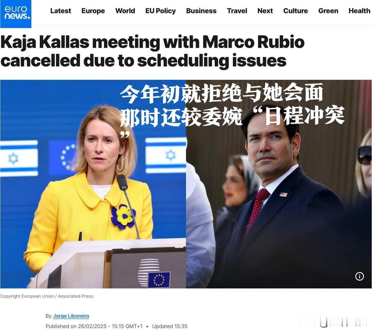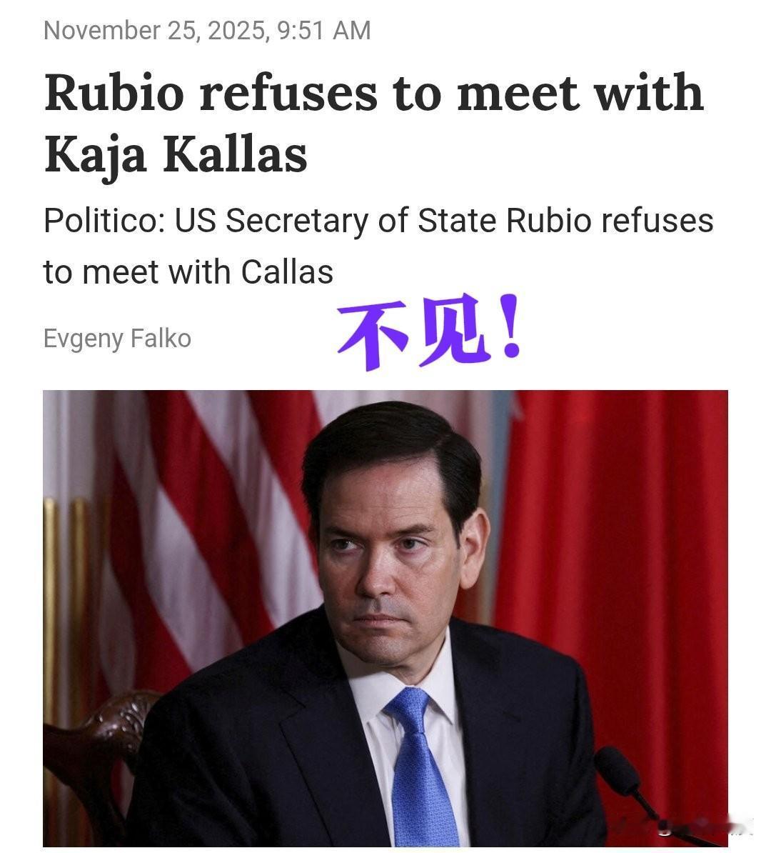 大大的W给鲁比奥。 美国务卿鲁比奥,多次拒绝与欧盟外交部一把手卡拉斯会面,尽管对方已经多次邀约。 鲁比奥是白宫团队中最亲欧的代表人物。 可他也知道和卡拉斯谈俄乌问题,纯属浪费时间——不见!