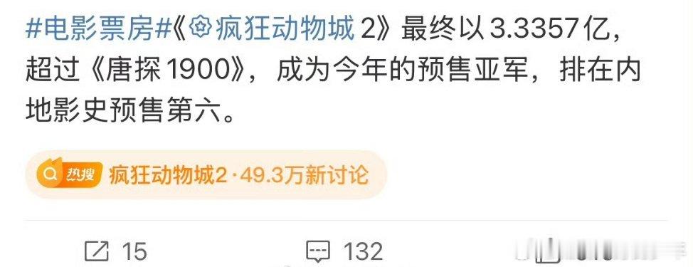 疯狂动物城2 最终以3.3357亿,超过《唐探1900》,成为今年的预售亚军,排在内地影史预售第六,够牛的啊!第一是哪部?疯狂动物城2