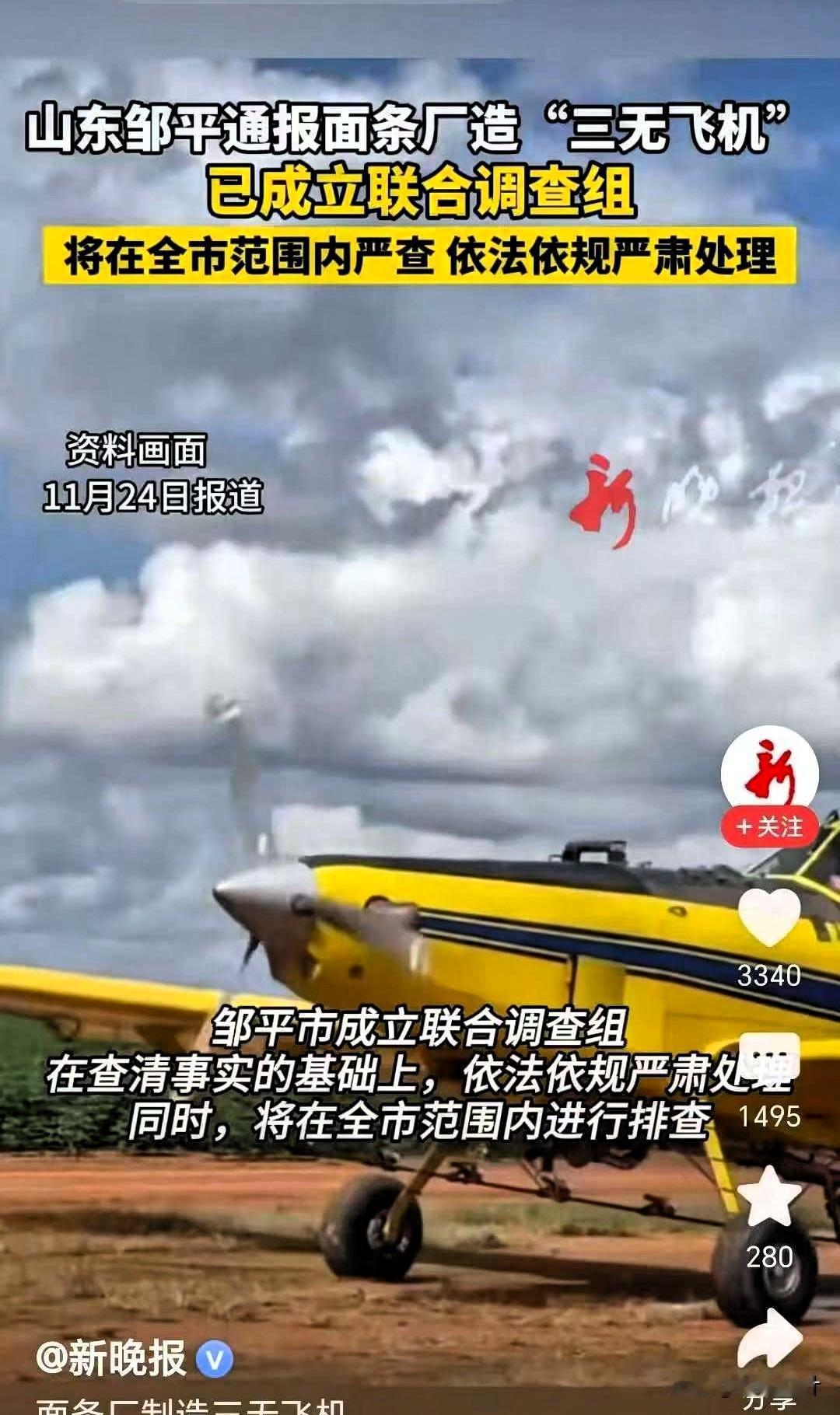 山东这次真的藏不住了, 全国人民都知道了。 山东一家面条加工厂造飞机的事,近期引发了不少关注。很难想象,一家以加工面条为主业的厂子,会跨界涉足飞机制造,更让人意外的是,这架自行组装的飞机还完成了试飞。 不过,这架飞机并非合法合规的产品,而是典型的“三无产品”——没有生产许可证,没有飞行资质,也未经过专业的安全检测。从曝光的情况来看,飞机的零件多是东拼西凑而来,发动机选用的是汽车发动机,部分连接部件甚至存在生锈的情况,这样的飞机上天,无疑存在极大的安全隐患,不仅关乎操作人员的生命安全,也会对周边环境和群众造成威胁。 不可否认,能将零散零件组装成可飞行的设备,体现了相关人员一定的动手能力,但创新不能脱离规则和安全的约束。飞机制造属于高精尖领域,对技术、质量和安全的要求极高,绝非“组装零件”那么简单,任何漠视规则、逃避监管的行为,都可能引发严重后果。 此次事件也给我们提了个醒:无论从事什么行业,创新都要守住安全底线,敬畏生命、敬畏规则是前提。相关部门对这类行为的严查严惩,正是为了维护公共安全秩序。