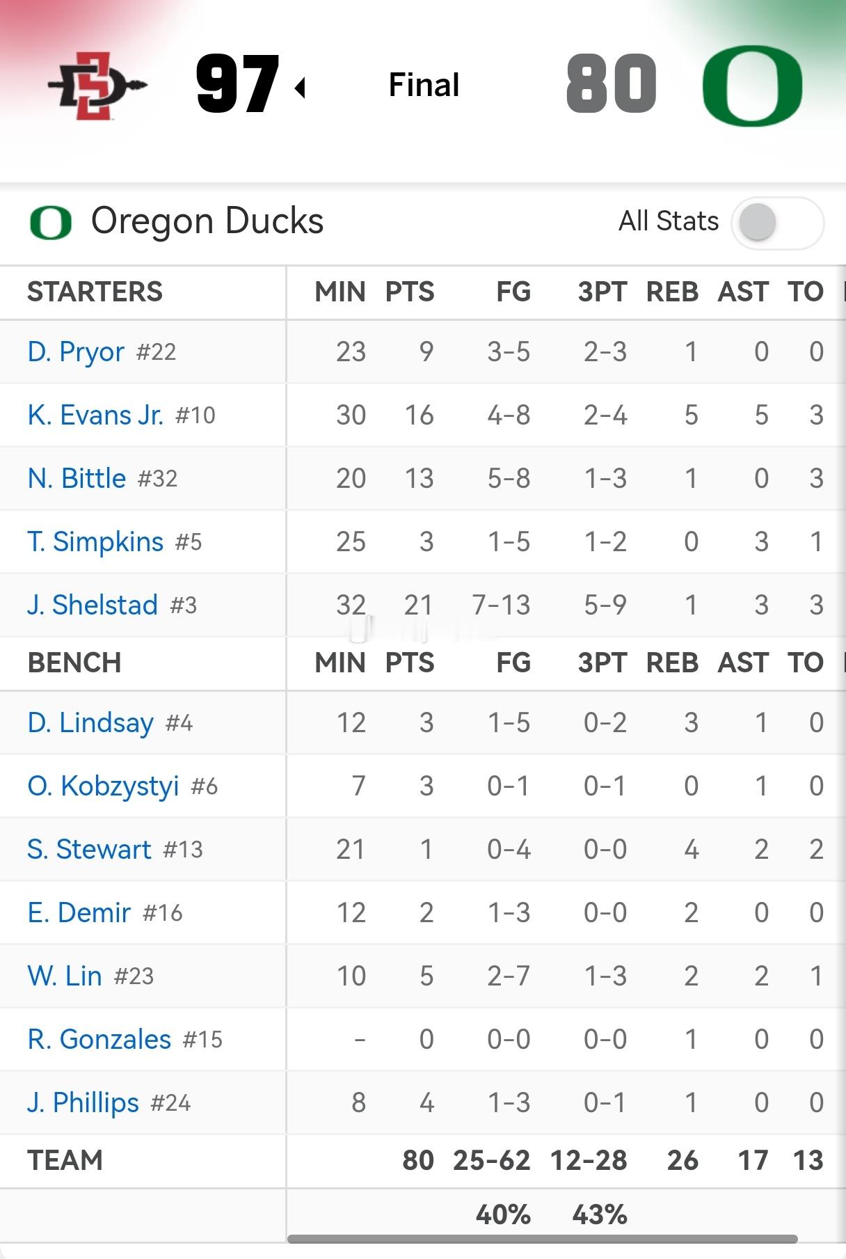 刚刚结束的一场NCAA比赛,俄勒冈大学背靠背比赛80:97惨败对手,林葳 上场10分钟,投篮7中2,其中三分3中1,得到5分2篮板2助攻(是替补中得分最多的球员),虽然整体命中率不高,但三分手感在慢慢回来。感觉林葳第一年就用来适应NCAA比赛节奏吧,查缺补漏寻找不足,在NCAA多打两年,第二年再让自己逐渐成为教练信任的首发控卫。留洋球员中国男篮