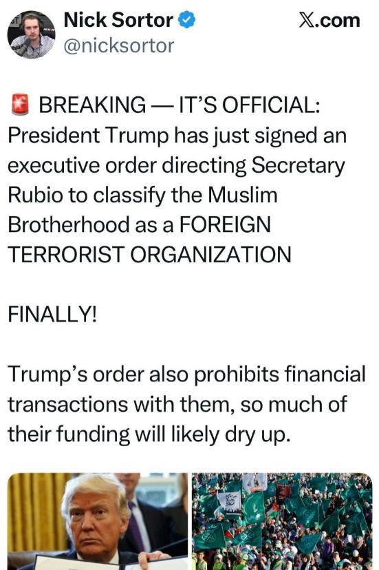 突发消息,正式确认: 川普总统刚刚签署行政令,指示 Rubio 国务卿将 Muslim Brotherhood 列为外国恐怖组织。 特朗普特意点了国务卿卢比奥的名,让他牵头把穆斯林兄弟会(简称穆兄会)的核心分支,往“外国恐怖组织”的名单上送。这道命令一落地,最狠的不是给它安上这个名头,而是直接把所有和它沾边的金融交易全封死,等于一把攥住了这个跨国组织的命门。 估计不少人对穆兄会没啥概念,这可不是随便凑凑的松散团伙。1928年在埃及成立,现在中东北非70多个国家都有它的分支,算下来得有300万成员,上到教授、老板,下到农民、学生,各行各业都有。 更关键的是它不缺钱,成员得按收入比例交“份子钱”,自己还开着清真寺、医院、银行这类实打实的机构,早年间甚至搞过准军事巡逻队,手上是有武装底子的。 特朗普这步棋算是踩对了路子,一上来就往钱眼上扎。美国政府早就在嚷嚷,说穆兄会的埃及、黎巴嫩分支跟哈马斯走得近,还涉嫌搞破坏美国利益的事儿。 现在行政令一签,国务院、财政部得联合情报部门查,30天内得交出调查报告,最多再拖45天,这些分支就可能被正式钉上“恐怖组织”的黑名单。到时候不光相关人员进不了美国,谁敢给他们塞钱,那就是犯法。 这对穆兄会来说,简直是釜底抽薪。以前就算埃及、约旦这些国家把它取缔了,它还能靠海湾国家的资助和海外的资金撑着。现在美国一卡脖子,它在美国的捐款、投资全得被冻起来,连跟海外机构的资金往来都得断。 要知道它维持日常运作、给穷人发救济,全靠现金流撑着,钱一断,底下的分支怕是先乱成一锅粥。 其实这事儿早有苗头,美国右翼盼这一天盼了好几年,特朗普第一任期就想干,这次刚开启第二任期就动手了。更逗的是,得州政府比联邦政府还急,上个月就抢先一步把穆兄会定成了“恐怖组织”,连带着把美国伊斯兰关系委员会(CAIR)也拉上了黑名单,气得CAIR直接把得州政府给告了。 不过外头人看这事儿,都觉得有点“雷声大,雨点小”。贝鲁特美国大学有个研究员就说,这政策看着就挺业余,说白了就是讨好美国和以色列的右翼支持者。 毕竟穆兄会在中东根扎得太深了,好多分支早就在当地藏到地下活动了,美国这金融禁令,未必能把所有资金渠道都掐死。而且这会儿美国还在撮合加沙停火,以色列根本不买账,哈马斯反倒守规矩了,这时候拿穆兄会开刀,有点转移注意力的意思。 CAIR那边也赶紧出来撇清关系,说别拿穆兄会当由头搞株连,美国本土的穆斯林团体跟它半毛钱关系没有。这话也不是没道理,之前就有阴谋论说美国穆斯林组织是穆兄会的“代理人”,现在行政令一出来,保不齐就有人借这个由头乱搞。 说到底,特朗普这招一方面是给国内的支持者交差,另一方面也是想在中东刷波存在感。但穆兄会都活了快一百年了,哪是一张禁令就能打垮的。接下来就看30天后的调查报告咋写,还有那些靠穆兄会援助过活的普通老百姓,会不会先成了这政策的替罪羊。 说到底,特朗普这招既是给国内支持者交差,也是想在中东刷存在感。但穆兄会都活了快百年了,不是一纸禁令就能打垮的。接下来就看30天后的调查报告怎么写,以及那些依赖穆兄会援助的普通民众,会不会先成了政策的牺牲品。