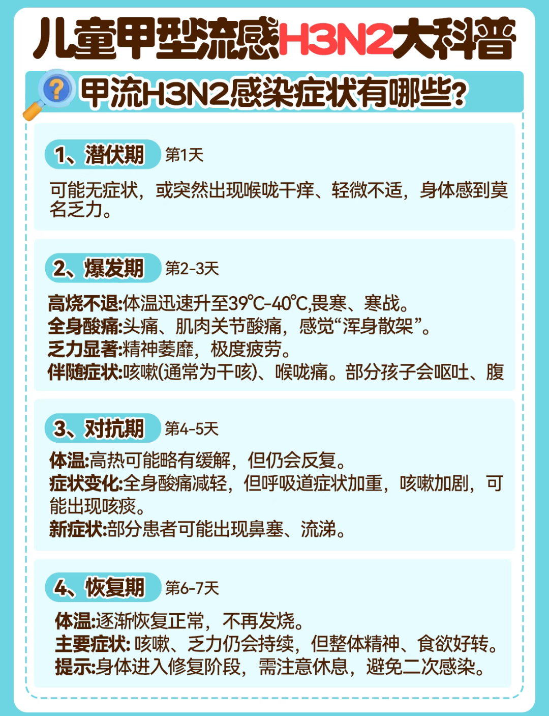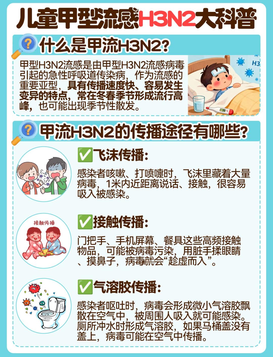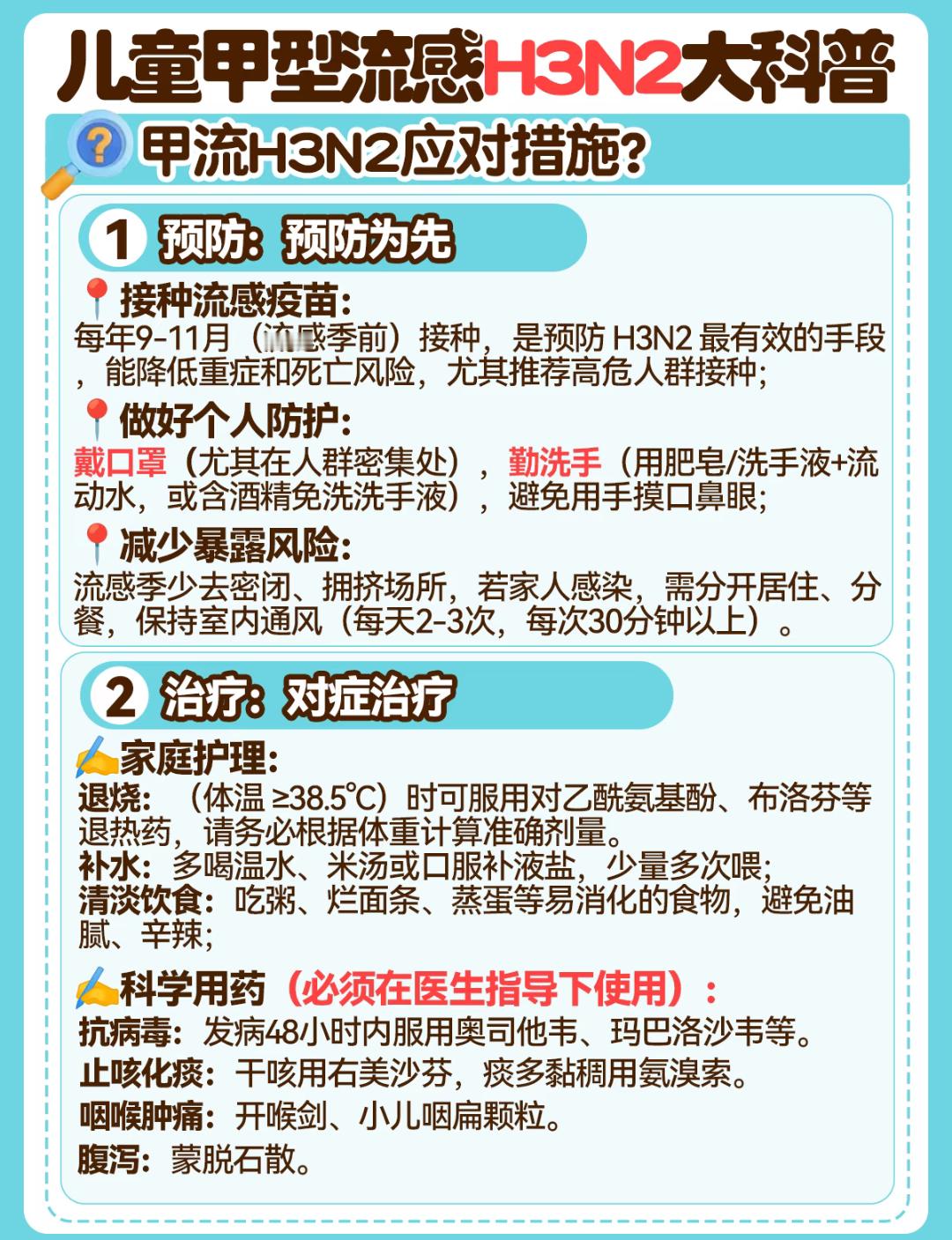 流感H3N2毒株来袭儿童如何应对 2025甲型流感病毒H3N2症状及科学护理指南:守护全家健康,从容应对流感季亲爱的家长朋友们,请注意了!随着气温逐渐转凉,又到了流感高发的季节。今年秋冬,甲型流感病毒中的 H3N2亚型 已成为主要流行毒株,来势汹汹、传播迅猛。尤其是免疫系统尚未发育完善的儿童和抵抗力较弱的老年人,极易“中招”。面对这场健康挑战,我们该如何科学预防、及时识别并有效应对?这份全面、权威的防护与护理指南请您务必收好! 🌟 什么是甲型H3N2流感?甲型H3N2流感是由甲型流感病毒H3N2亚型引起的一种急性呼吸道传染病。作为流感家族中极具“变异性”的“常客”,它善于伪装、不断进化,能够逃逸人体既往建立的免疫防线,因此即使往年接种过疫苗或感染过流感,仍可能再次中招。该病毒常在冬春季节形成流行高峰,近年来也呈现提前暴发的趋势,防控形势不容小觑。 🌟 甲流是如何传播的?H3N2病毒的传播途径多样,防不胜防,需格外警惕:1️⃣ 飞沫传播:当感染者咳嗽、打喷嚏或大声说话时,会释放出含有大量病毒的飞沫,若在1米范围内被他人吸入,极易造成感染。2️⃣ 接触传播:病毒可在门把手、电梯按钮、玩具、手机等物体表面存活数小时。手部接触污染表面后,再触摸口、鼻、眼等黏膜部位,便会“病从口入”。3️⃣ 气溶胶传播:在密闭、通风不良的环境中(如教室、办公室、公共交通工具),微小的病毒颗粒可长时间悬浮于空气中,增加远距离传播风险。 🌟 感染甲型H3N2有哪些典型症状?与普通感冒不同,甲流起病急、进展快,全身中毒症状尤为突出,堪称“猛虎下山”:✅ 突发高热:体温迅速飙升至38.5°C~40°C以上,持续3~5天,退烧药效果有限,易反复。✅ 全身酸痛:剧烈头痛、肌肉关节疼痛、极度乏力,孩子可能表现为“五马分尸”般的痛苦,甚至因小腿肌炎而拒绝行走。✅ 呼吸道症状:干咳频繁、咽喉剧痛、鼻塞流涕,部分患者伴有眼结膜充血(眼睛发红)。✅ 消化道反应:尤其在5岁以下儿童中常见,可能出现恶心、呕吐、腹痛、腹泻等胃肠道症状。 🌟 科学应对策略:预防为先,治疗有序✅ 预防篇:构筑坚实免疫屏障📍 接种流感疫苗——最经济有效的“防护盾”每年9月至11月是接种流感疫苗的黄金时期。2025年流感疫苗已针对H3N2等主流毒株优化配方,保护更具针对性。接种后约2周可产生有效抗体,不仅能显著降低感染风险,更能大大减轻症状、防止肺炎、心肌炎等严重并发症的发生。建议6月龄以上人群,尤其是儿童、老人、孕妇及慢性病患者优先接种。📍 加强个人防护——日常习惯是关键外出或进入人群密集场所时,科学佩戴医用外科口罩;勤洗手,使用肥皂和流动水按“七步洗手法”彻底清洁,或使用含酒精的免洗洗手液;咳嗽或打喷嚏时用纸巾或肘部遮挡口鼻,避免飞沫扩散。📍 减少暴露风险——营造安全环境流感高发期尽量少去密闭、拥挤的公共场所;家庭成员若有人感染,应分开居住、分餐制,保持室内空气流通,每日开窗通风2~3次,每次不少于30分钟。 ✅ 治疗篇:对症护理,把握黄金时机1️⃣ 家庭科学护理🎈 退烧管理:当体温≥38.5℃或伴有明显不适时,可遵医嘱使用对乙酰氨基酚或布洛芬,务必根据体重精准计算剂量,切忌重复用药。🎈 充分补液:鼓励多喝温水、米汤、果汁或口服补液盐,少量多次,预防脱水。🎈 清淡饮食:选择粥、烂面条、蒸蛋、蔬菜泥等易消化食物,避免油腻、辛辣刺激。2️⃣ 规范药物使用(须在医生指导下进行)👉 抗病毒治疗:发病48小时内启用奥司他韦、玛巴洛沙韦等特效药,可显著缩短病程、降低重症风险。👉 止咳化痰:干咳可选用右美沙芬,痰多黏稠可用氨溴索。👉 缓解咽痛:开喉剑喷雾、小儿咽扁颗粒等可缓解局部不适。👉 应对腹泻:蒙脱石散有助于保护肠黏膜,但需注意补液防脱水。⚠️ 警惕重症信号,立即就医!若出现以下情况,提示病情可能加重,请立即前往医院:持续高热超过3天不退;呼吸急促、胸闷胸痛、嘴唇发紫;精神萎靡、意识模糊、抽搐;尿量明显减少、哭时无泪等脱水表现;原有基础疾病加重。 结语:流感虽强,但并非不可防、不可治。只要我们做到“早识别、早预防、早干预”,科学应对,定能守护家人平安,温暖度过这个流感季。