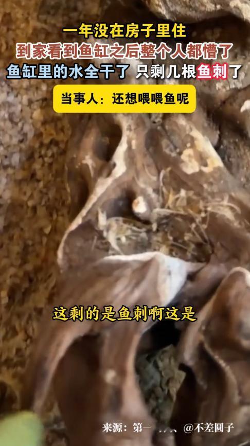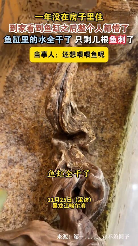 “离了个大谱!”11月23日,黑龙江哈尔滨,一女子在家里养了一缸鱼,收拾完后就搬到另一间房子住了,1年后回家打算通通风,结果发现鱼缸已经干了,里面的鱼也不见踪影,只能找到些许鱼刺!网友:就算是乌龟也不能这么养吧? 不知道大家有没有在北方的冬天待过,供暖之后,外面非常寒冷,但好在家里面暖和,温度能够达到20多度,所以家中的东西一定要妥善放置,更不能长期没有人。 去年冬天,李女士收拾完屋子后,发现柜子上空落落的,于是就买了个鱼缸,然后养了些鱼,又过了几天,她就搬到另一间房子去住,之后就一直没有回来过。 养鱼前李女士还咨询了下朋友,表示这玩意非常耐活,所以不用精心照料,前不久,家里面供暖后,李女士就打算回来收拾收拾、通通风,顺道喂下鱼。 结果进门后,发现鱼缸早就已经干了,别说鱼了,就连水都挤不出来一滴!她仔细找了找,只看到几根鱼刺还在缸中。 据李女士推测,应该是冬天有暖气的缘故,导致鱼缸的水很快就被蒸干了,最终鱼被活活渴死了。 网友看后表示,别说是鱼了,这环境下养只乌龟,一年不管都得死! 所以说大家在养鱼之前一定要做好功课,及时的换水和喂食,这样才不会白白葬送这些生命。 信息来源:《一年没在房子里住,到家看到鱼缸之后整个人都懵了,鱼缸里的水全干了,只剩几根鱼刺了,当事人:还想喂喂鱼呢》冀时