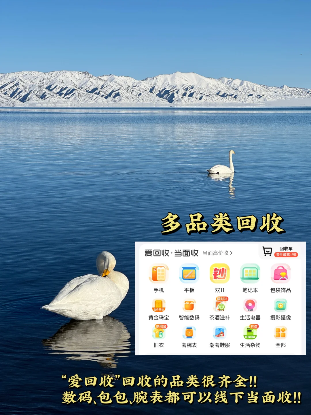 冬日的赛里木湖,是被大自然偏爱的“天空之镜”!优雅的白天鹅、碧蓝的湖水、吊挂的蓝冰和雪地奔跑的小狐狸....日落时分,蓝调渐入粉调,来过一次,就彻底迷恋上赛里木湖的blue pink hour~ - 📸拍照机位 🔸松树头:既能俯瞰果子沟大桥全景与连绵山丘,仿佛闯入童话世界;山下的松树头S湾更是绝配,雪山映着蓝色冰湖,蜿蜒公路添了份温柔,随手拍都是大片 🔸克勒涌珠:近距离观赏冰花与冰泡泡的绝佳地,日落时分,粉色霞光洒在天鹅身上,宛如给它们披上了粉色羽绒 🔸点将台:登高远眺的好选择,清晨或傍晚可邂逅“日照金山”,霞光漫天时,整个赛里木湖都被镀上温暖滤镜 🔸亲水滩:常年有白天鹅栖息,运气好还能遇见黑天鹅,能近距离与天鹅互动 🔸网红灯塔:傍晚时分,提一盏小灯漫步至湖边灯塔,粉色天空作背景,氛围感直接拉满 🔸蓝冰挂:悬空而下的蓝色冰挂如同魔法世界的馈赠,晶莹剔透又充满力量感,是冬日独有的震撼景观。 🔸月亮湾:从东门进入后沿栈道前行,雪山、草地、风车依次映入眼帘,画面纯净得像从漫画里走出来的场景。 🔸 S弯公路:雪山、海子相映,自驾行驶其间,仿佛把“诗和远方”都踩在了车轮下 - 外出旅行,包包主要都是装拍摄设备,所以自己买的很多包包都闲置了。之前问线下奢侈品回收店询问总被压价,直到听朋友说爱回收什么都收,奢侈品大牌包包也可以。我就想着去试试,提前在小程序上预约了门店,2000多家门店,我家附近商场就有,到店还挺方便的。到店以后体验了他家的回收模式——全国上百位商家在线出价,价高者得,报出的价格比我预期高了好几百,卖的舒心,收的放心! 店员检查专业又耐心,当面确认完,20来分钟就当面放款到账,速度绝了。而且还能收旧手机、平板,下次准备把家里闲置拍摄设备也带来!有闲置想变现的宝子,可以直接冲爱回收,让闲置物帮你攒钱!