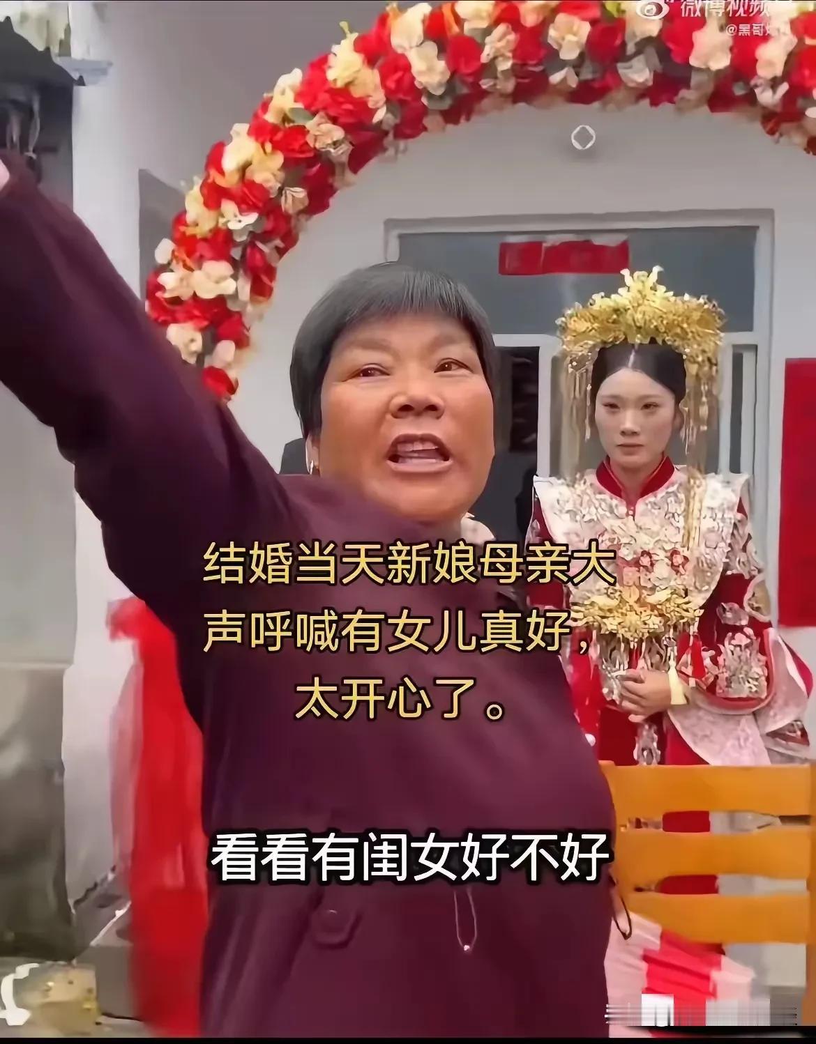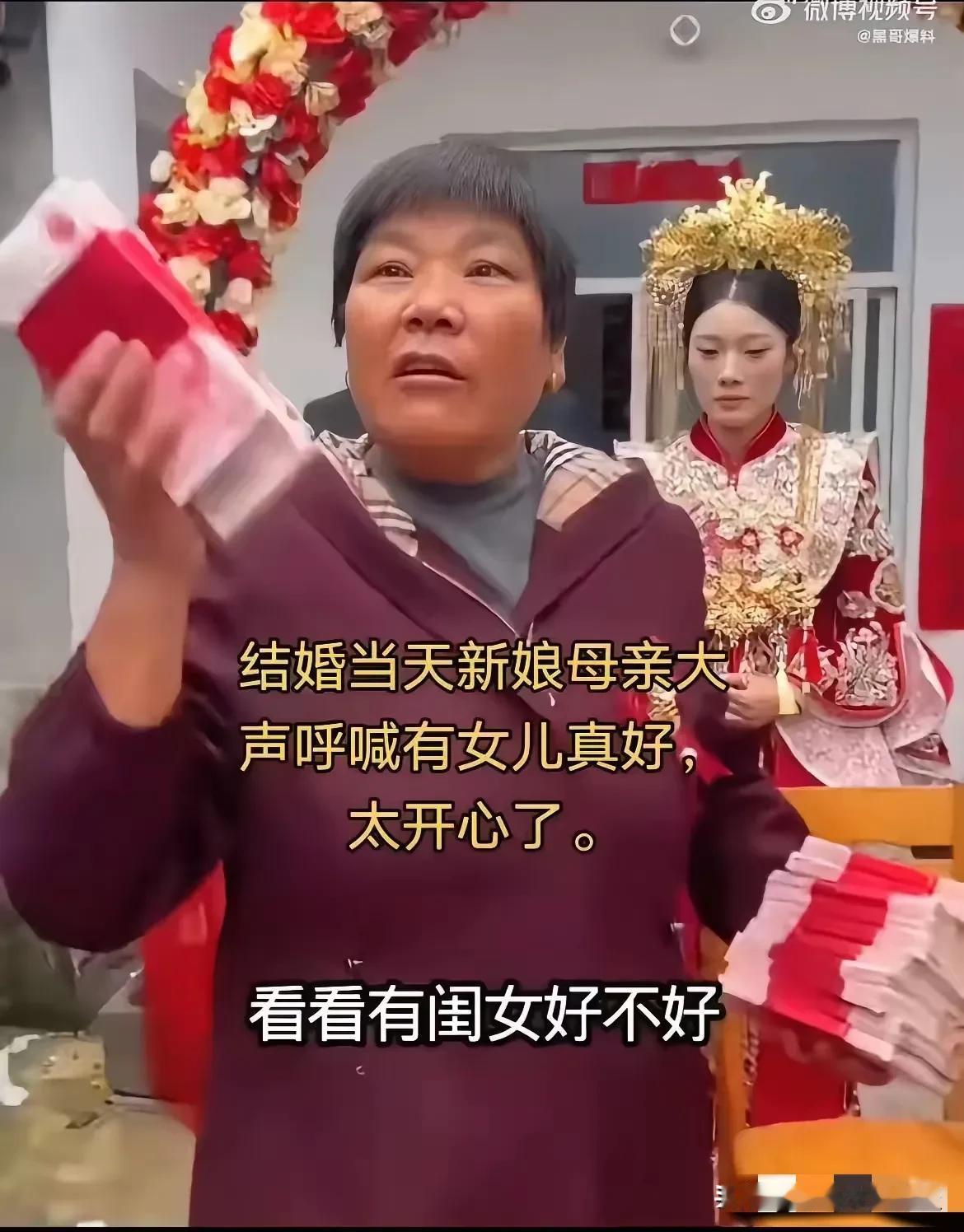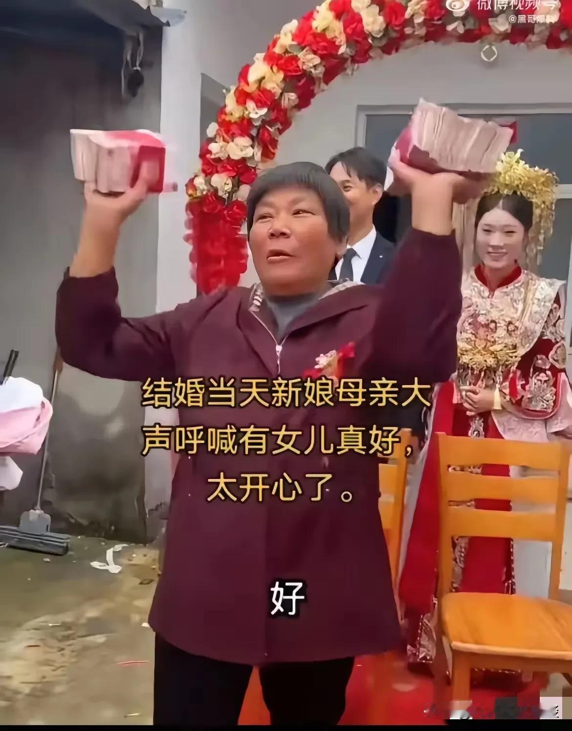 养闺女真好,闺女出嫁的日子就是脱贫致富的时候。这位妈妈在女儿出嫁时,双手举着20万巨款,当着大家说看看养女儿好不好?看她兴奋的样子,是发自内心的。简直太高兴了。 在她眼里,养闺女就是发财的财路。这和养儿子的对比差距太大了,儿子结婚需要拿出几十万,表面上高兴,内心是沮丧的。