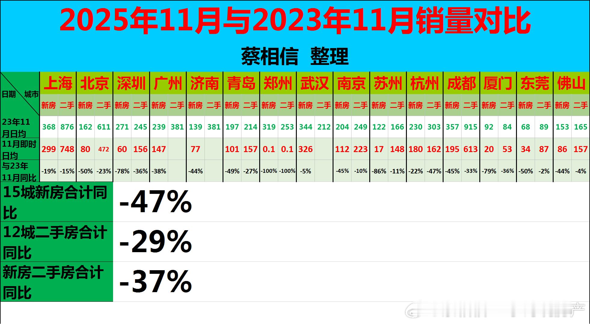 我用2025年11月的数据与2023年11月的数据进行对比,发现:新房销量同比下降47%,二手房销量同比下降29%。房地产房价