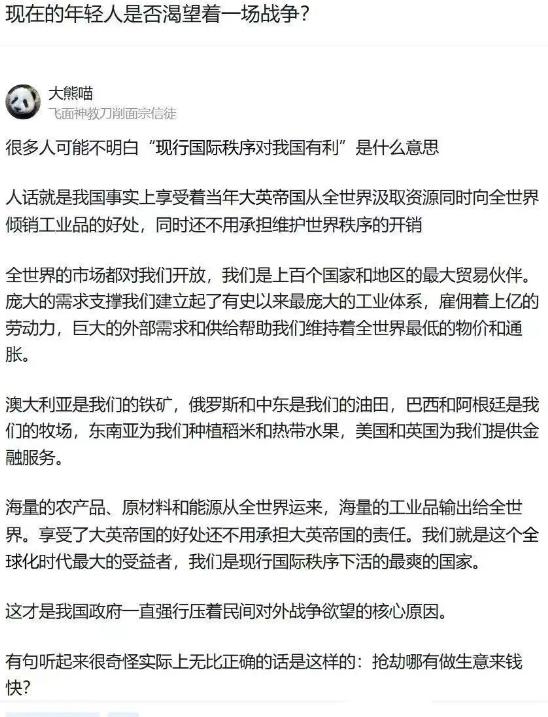 现行国际秩序对中国最有利! 当前国际秩序下,咱们是世界上最大的工业制造国,所有的工业产品,畅销全世界。在全球地球村的影响下,我们是150多个国家和地区的最大贸易伙伴,这种强大的贸易优势,让咱们得以持续发展。 当前国际秩序,虽然还是欧美世界主导,但是美国的影响力,早已今非昔比。欧洲的影响力,也在衰弱。而咱们凭借贸易全球的策略,那真的是国运畅通。一旦爆发战争,这条贸易全球的路线,可能就要受到影响。所以说不到特殊时刻,是不会轻言战争的,大家都应该明白。 所以不管怎么说,当前国际秩序,完全有利于我,而且最重要的一点,现在的国际秩序,不需要我们付出多大的责任,一旦是国际社会有事,首先找的是美国去处理。 比如说尼日利亚基督徒,遭到大规模屠杀,那也是跑到美国求帮助。不管咋说,美国军事实力还是很强大,我们也没必要再去管那么多国际事务,就闷着头发展经济就好了。当然了,现在的国际秩序,对美国也有利,因为美国还是霸权还在, 但是贸易第一的咱们,想要做到国富民强,现在还没到,至少要贸易几十年以后,真正的国富民强,以后再去改变也不迟。总而言之,国际秩序有利于我,不需要付出太多责任,就是闷着头挣钱就好了。