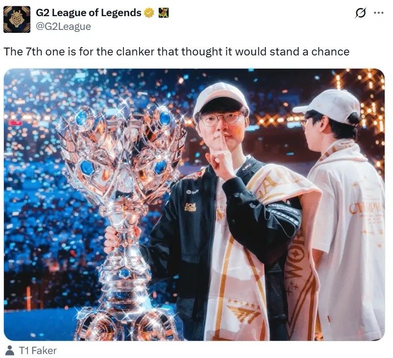 G2为Faker应援哈哈哈哈G2官方为Faker应援:第七冠献给那个以为自己有机会的铁皮佬昨日马斯克想要尝试Ai人工智能能否在2026年击败最佳人类战队,对此G2官方为应援,配文如下:第七冠献给那个以为自己有机会的铁皮佬💡注:这个称呼是对马斯克的趣味调侃,一方面马斯克常和特斯拉、SpaceX等科技硬件项目绑定,“铁皮”能关联到这些科技产品的属性。马斯克要用ai挑战人类英雄联盟faker