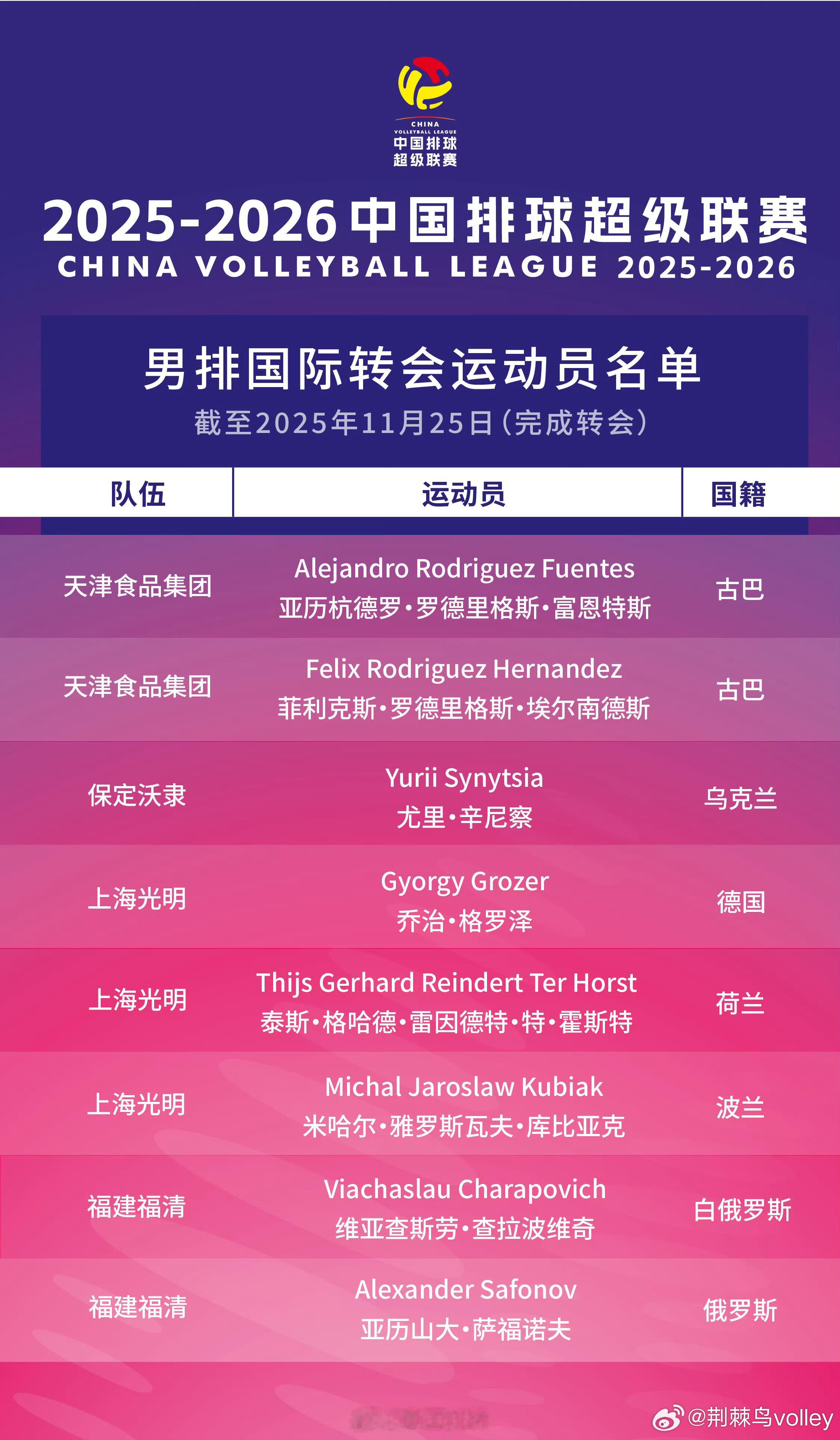 中国排协发布截至目前转会完成的运动员名单。大福建请了2外援。男排中国男排超级联赛