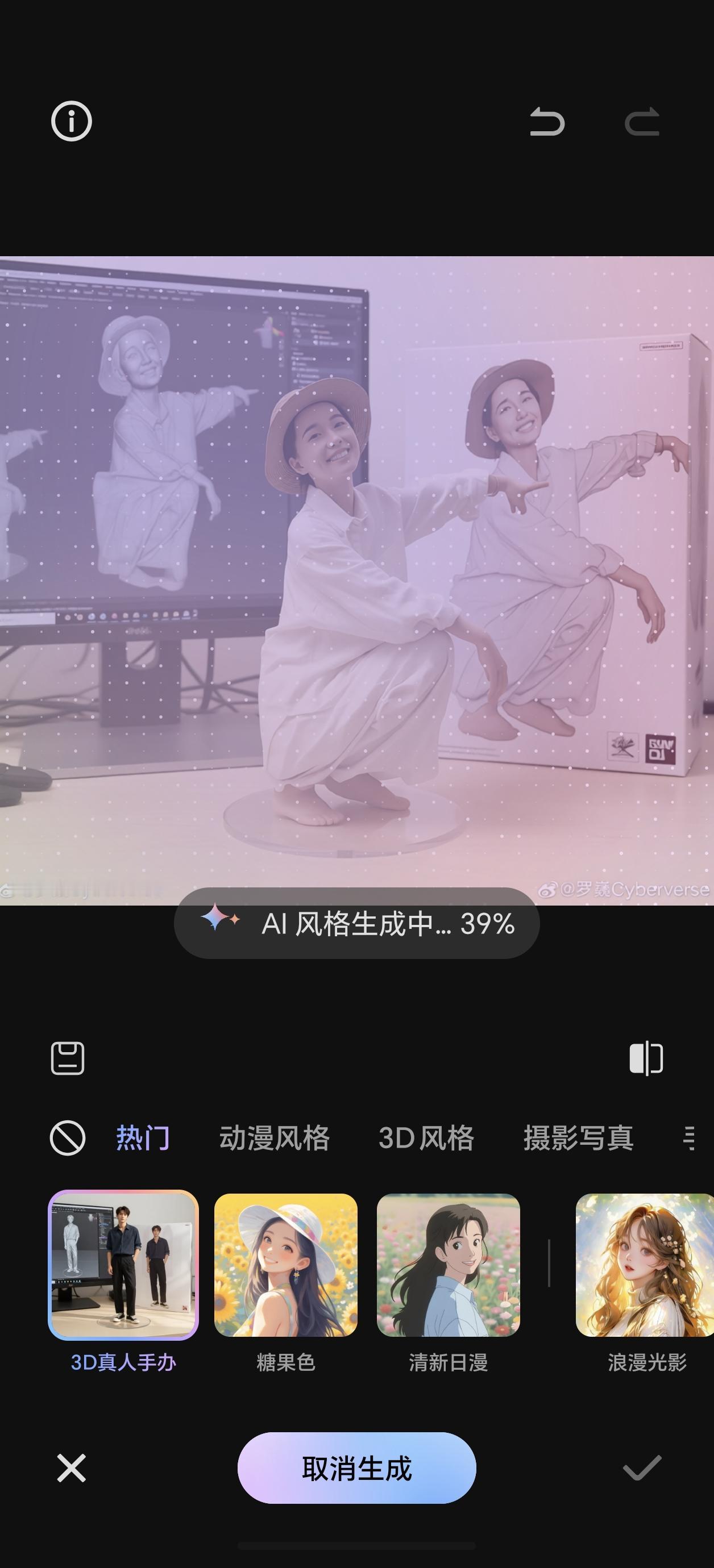 荣耀首席影像工程师罗巍又给荣耀手机用户带来新福利,近日图库上线:3D真人手办滤镜功能,操作步骤如下:图库选择照片>AI编辑>AI风格>3D这人手办,即可一键制作生成,我亲自试一下,蛮好的。 畅聊数码新品