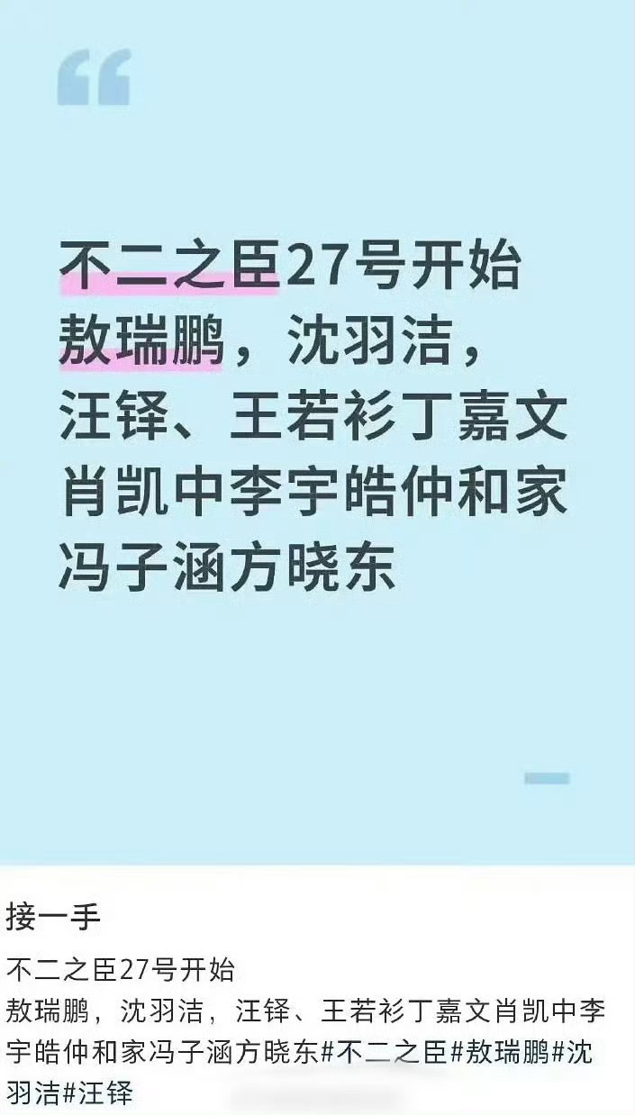 《不二之臣》开始剧本围读了,男女主就是敖瑞鹏和沈羽洁,其他配角汪铎、王若衫、丁嘉文、方晓东等并没有网传的两位演员,这个阵容看下来敖瑞鹏一番男主很稳欸敖瑞鹏不二之臣单抗敖瑞鹏单抗