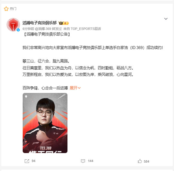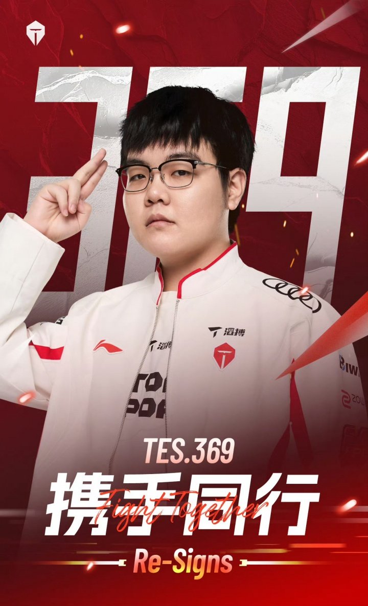 你也将余生绑在滔搏?369自19年开始效力TES 这将是其在TES的第六年TES官方发布公告,与上单选手369成功续约,而这将是369在TES的第六年。369自19年加入TES,期间在21年续约至今!如何评价369在TES的这些年表现?滔搏官宣369续约 uzi被曝已签约 英雄联盟s15