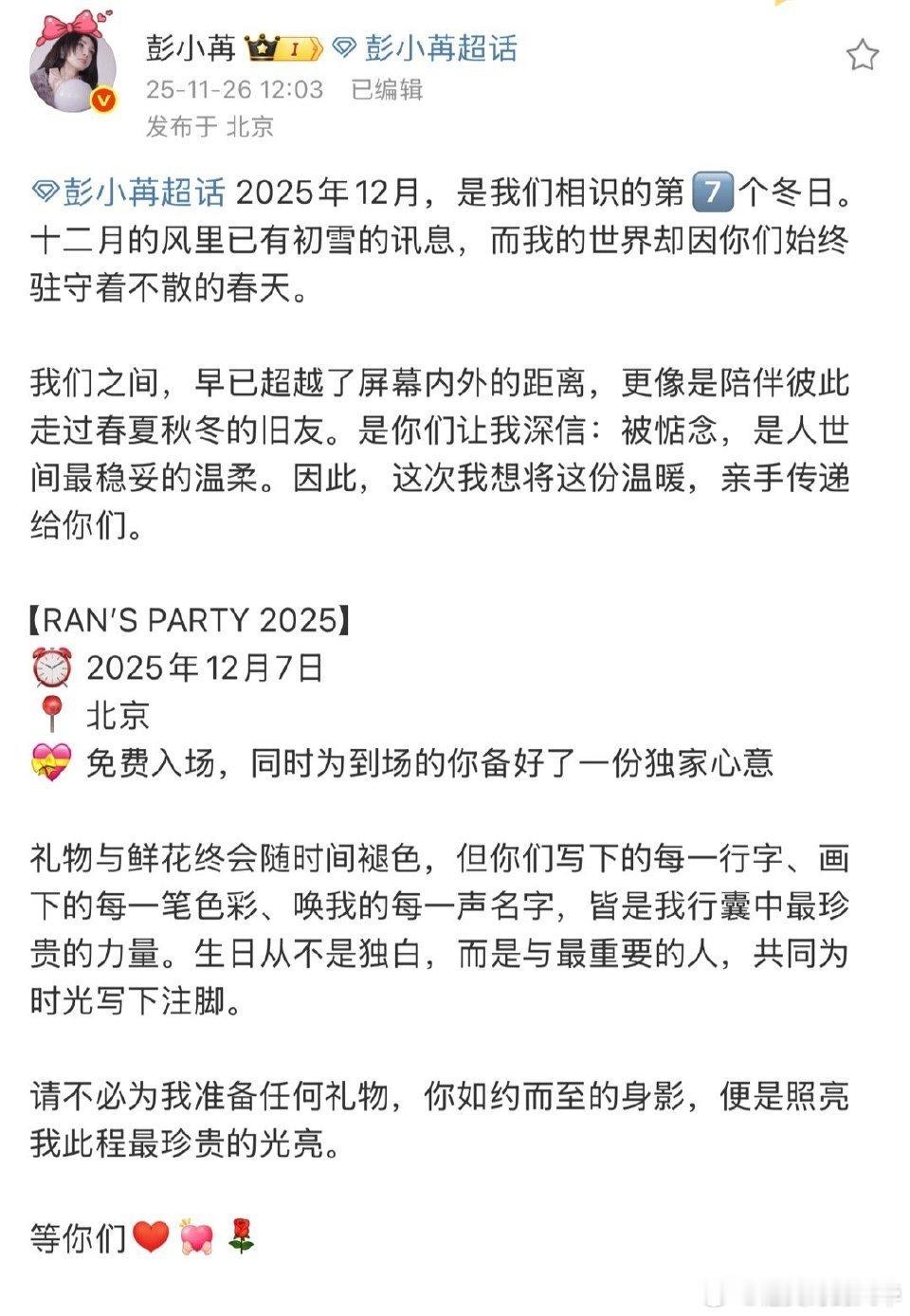 彭小苒 请不必为我准备任何礼物 破防了!彭小苒把粉丝的陪伴视作最珍贵的光,一句“不必准备礼物”满是真诚,多次感恩粉丝不离不弃,这种双向奔赴的温柔,真的太戳心了!