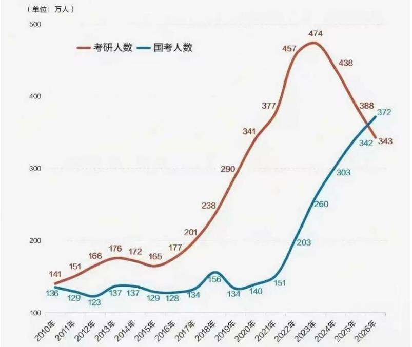 历年国考人数的数据走势,是一个观察中国经济状况很好的指标。 我们看图中的国考人数走势,从2010年到2019年的十年时间,相对来说是比较稳定的,国考人数大概是在125-135万人的区间,而这十年恰恰也正是中国经济发展最活跃的时期,所有人在这十年都感受到经济发展带来的好处,所谓对经济发展有“体感”。 然而从2020年开始,国考人数就开始了一路狂飙上升的趋势,每年增加四五十万人的速度攀升,纵然是有一些特殊因素的因素的影响,但这也充分反映了现实经济状况,整个社会都将考公考编当做了职业选择的首选,这对中国经济来说是一个很不好的现象,背后实质上是在积累一个不可未知的危机。 这一轮经济调整,我们就看一个指标,国考人数如果持续攀升,那说明我们的经济依然还是会比较艰难,经济复苏和转型依然在持续调整中,等到哪一天国考人数开始掉头下降了,那中国经济将迎来新一轮的发展周期。