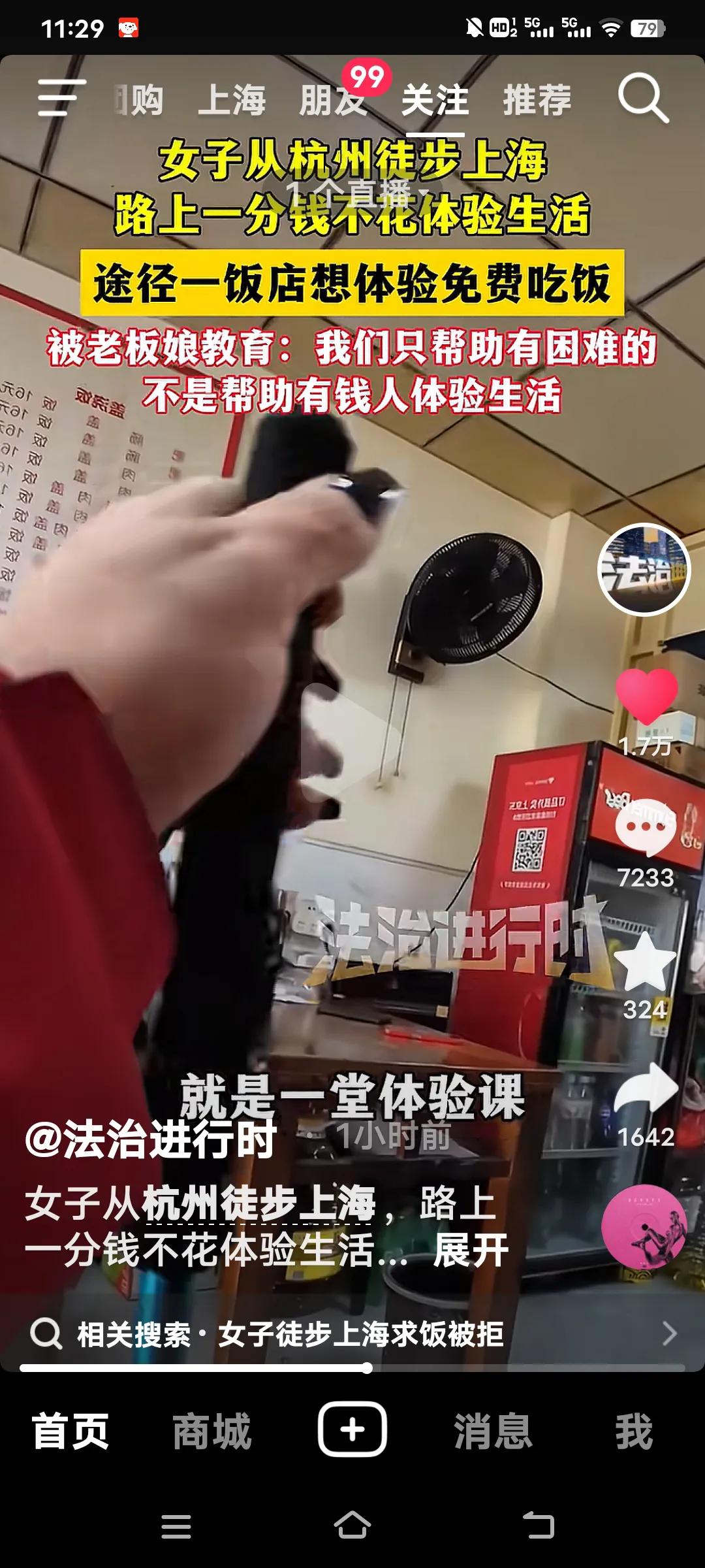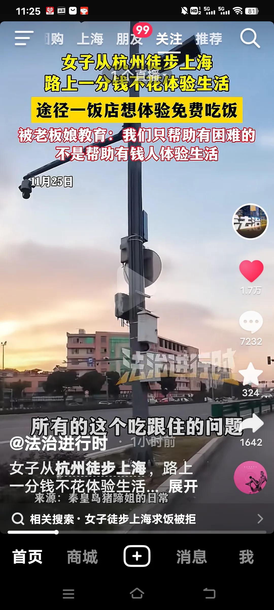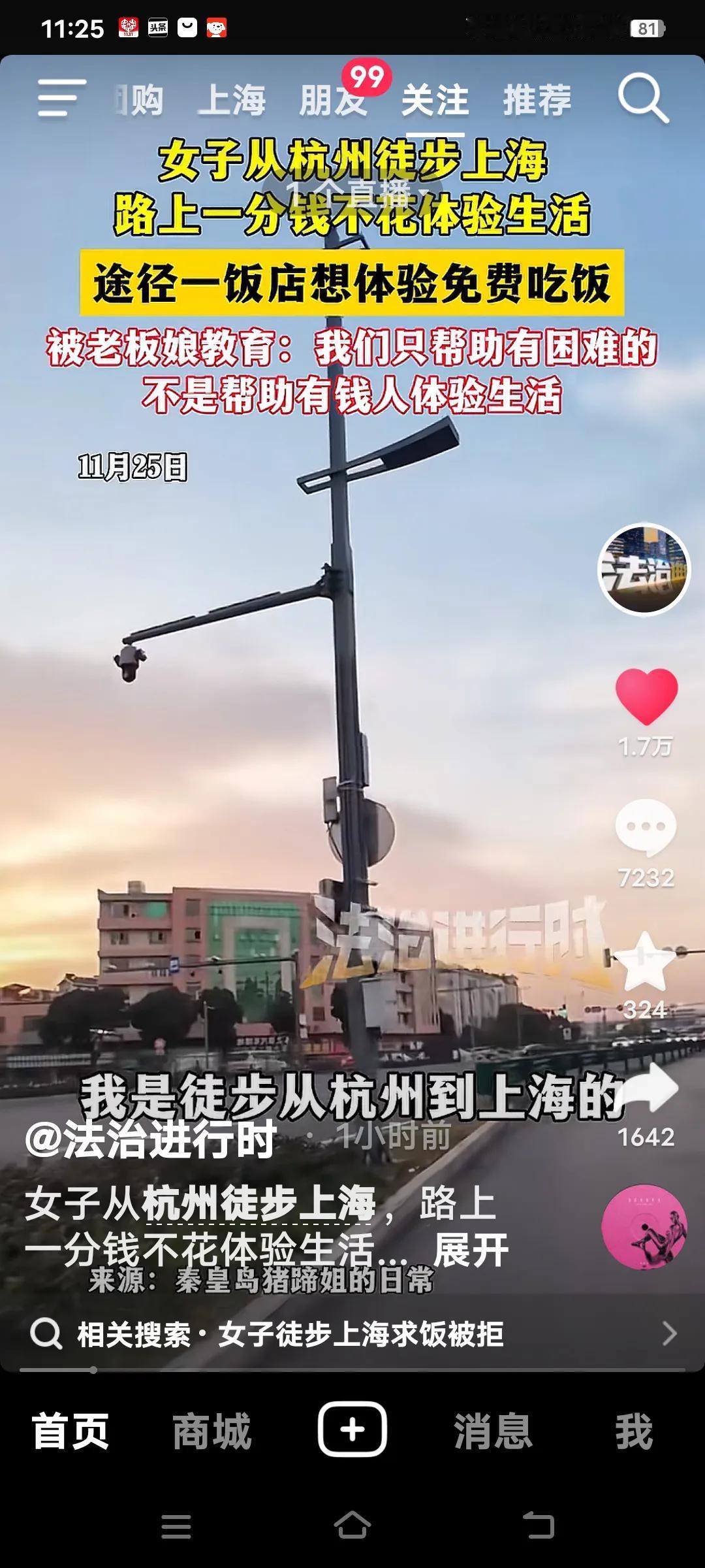 一女子从杭州徒步上海路不花一分钱,体验生活,途经一个饭店,问老板娘能免费吃饭吗? 被老板娘一顿好说,免费吃饭,我们只帮助有困难的,不是帮助有钱人体验生活的。女子却说请您帮个忙,这是一堂体验课。 感觉太可笑了,还有这体验生活的,你可以不吃给钱吧,哪能这样想?可不吃不喝吗?做不到就得给钱,开饭店的也没有容易赚钱的。 从杭州到上海不是三里五里,这样体验生活。估计哪个老板都不会答应的,如若遇到难处,谁都可以给你吃,别拿生活开玩笑。饿了就买点,不是拿别人的辛苦付出来体验了!杭州一日徒步 女游客徒步 杭州徒步 浙江徒步