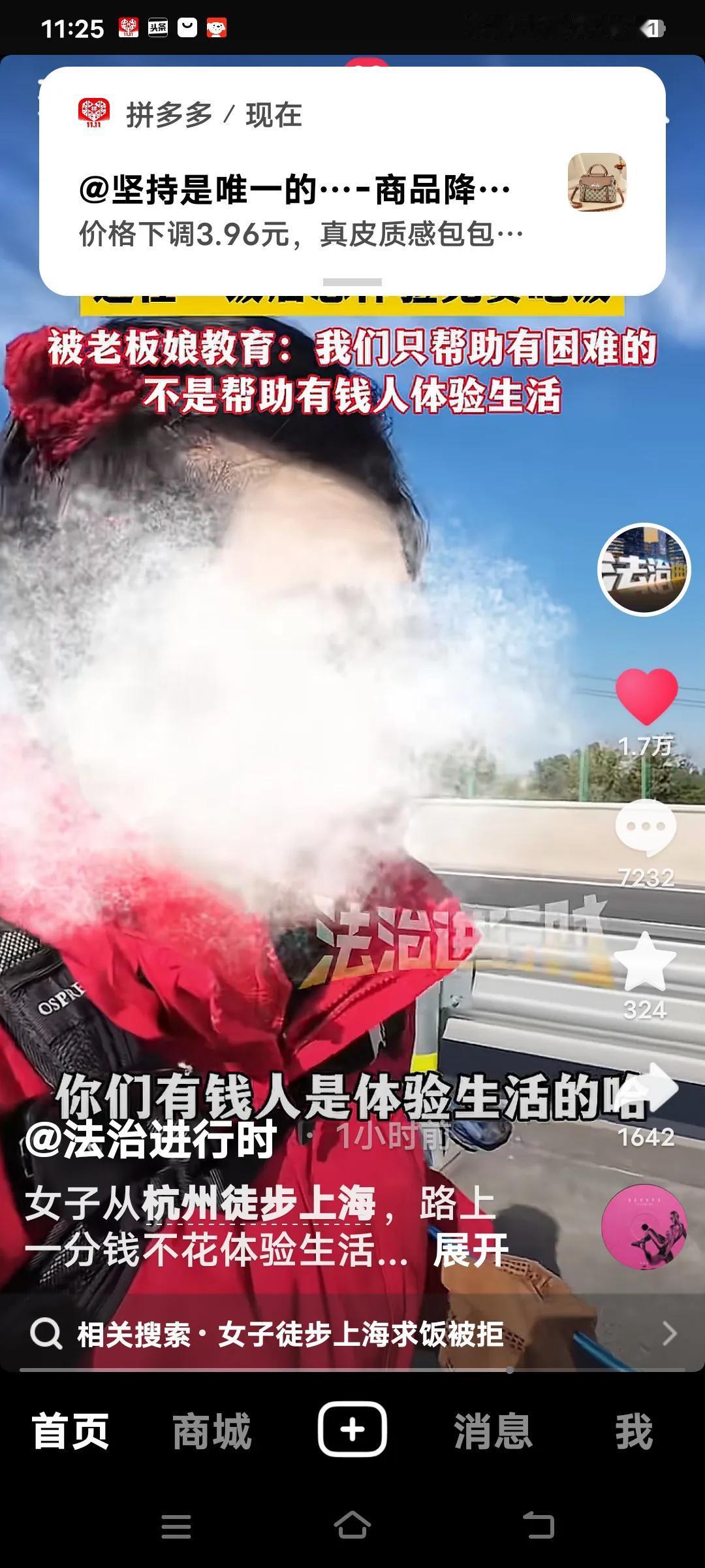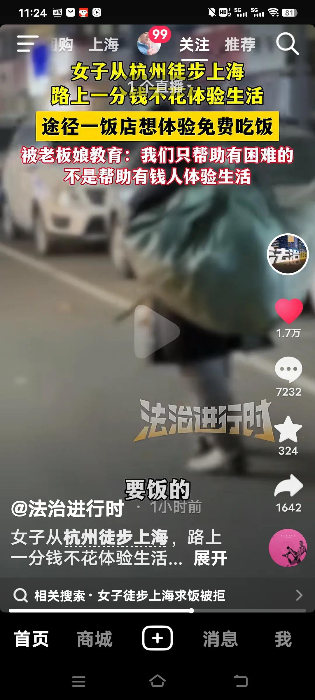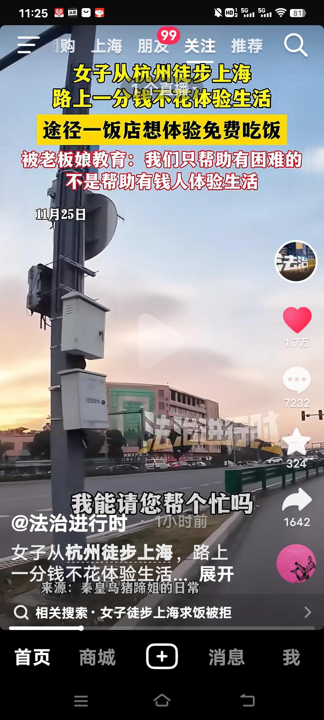 一女子从杭州徒步上海路不花一分钱,体验生活,途经一个饭店,问老板娘能免费吃饭吗? 被老板娘一顿好说,免费吃饭,我们只帮助有困难的,不是帮助有钱人体验生活的。女子却说请您帮个忙,这是一堂体验课。 感觉太可笑了,还有这体验生活的,你可以不吃给钱吧,哪能这样想?可不吃不喝吗?做不到就得给钱,开饭店的也没有容易赚钱的。 从杭州到上海不是三里五里,这样体验生活。估计哪个老板都不会答应的,如若遇到难处,谁都可以给你吃,别拿生活开玩笑。饿了就买点,不是拿别人的辛苦付出来体验了!杭州一日徒步 女游客徒步 杭州徒步 浙江徒步