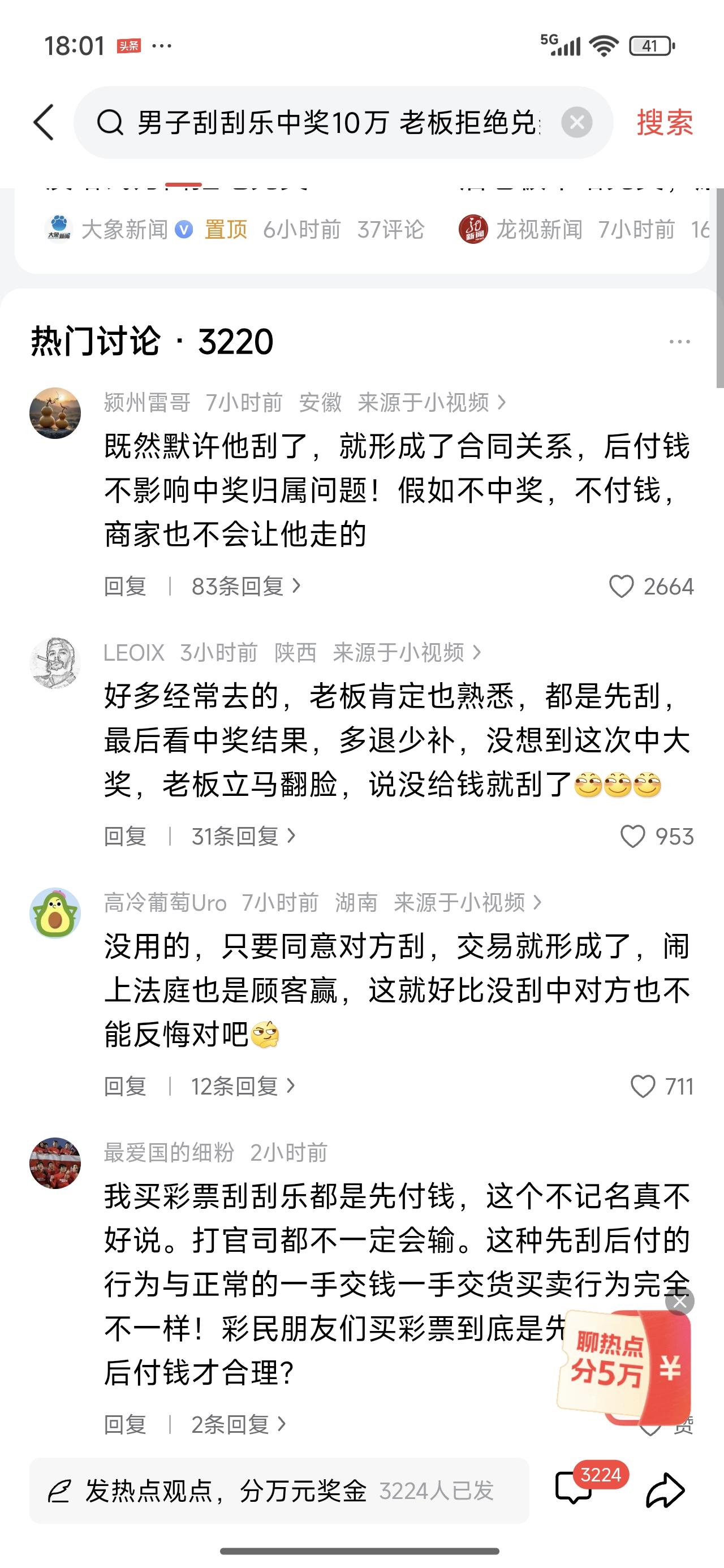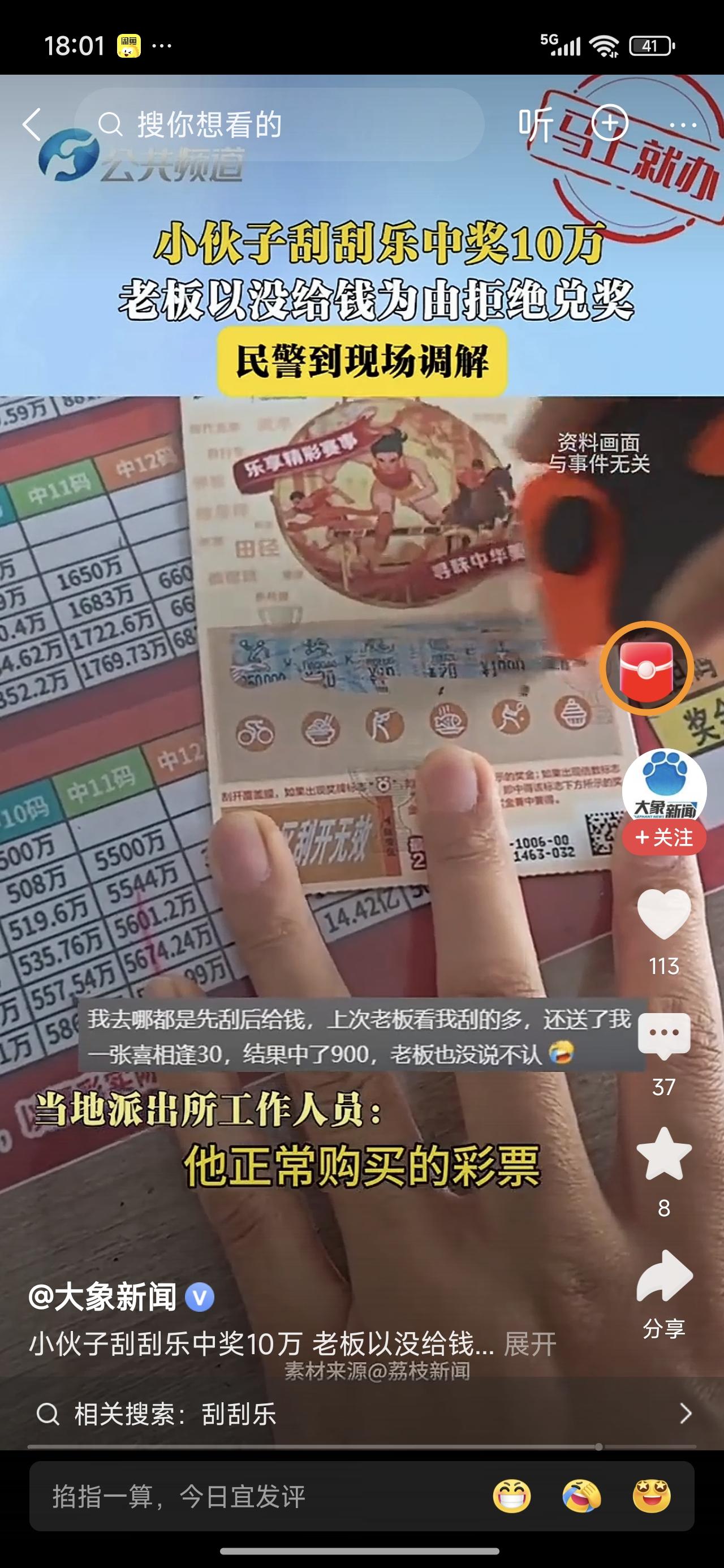 刮刮乐中奖十万,老板不给兑奖!玩不起了。。。 事情是这样的,一般情况下,你拿了刮刮乐,中个几十块钱,扣去中的,剩下的多退少补。这是大部分时间是这样做的。因为轻易也没有大奖。 大家都心照不宣。 这一次不同,小伙子中了十万,老板急眼了,不给兑奖了。说什么你还没有给我钱。 没给钱,你怎么给他刮了呢? 一番调解,还是要给人家的。 评论区比老板明白。 所以说人品这东西,看额度,额度大了,真不好说。这是十万,百万呢,还有可能出人命呢? 人为财死鸟为食亡,老祖宗,诚不欺我!