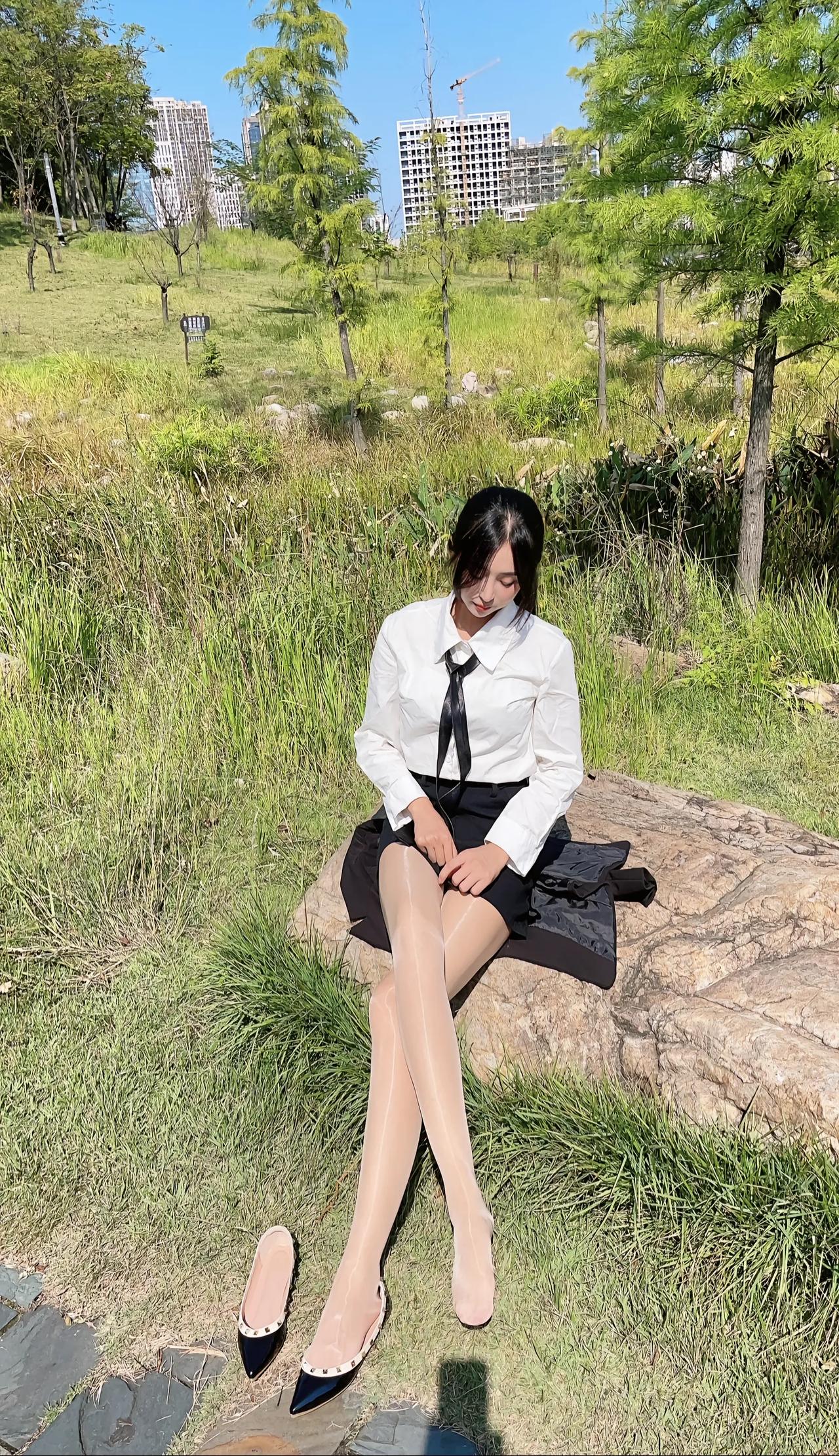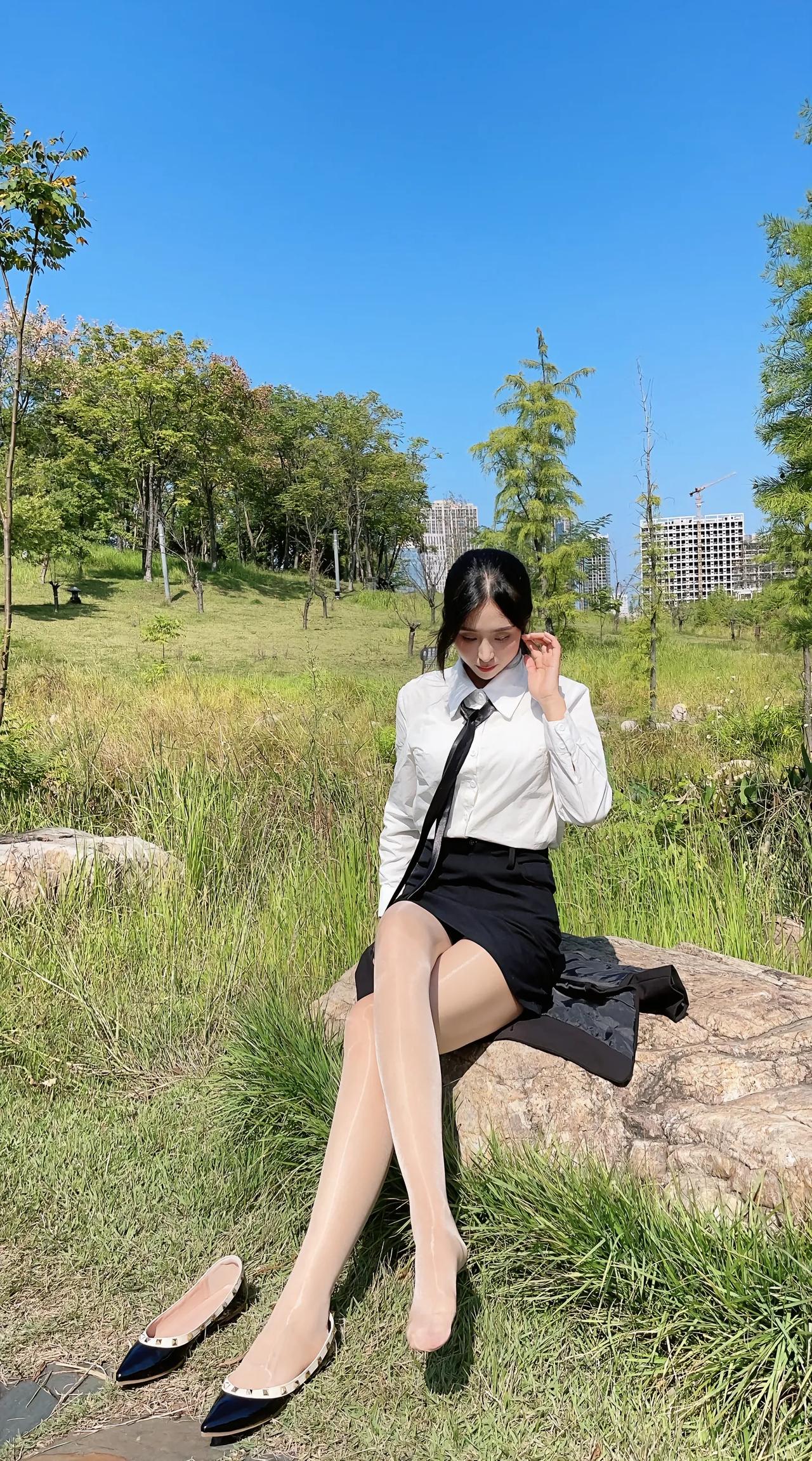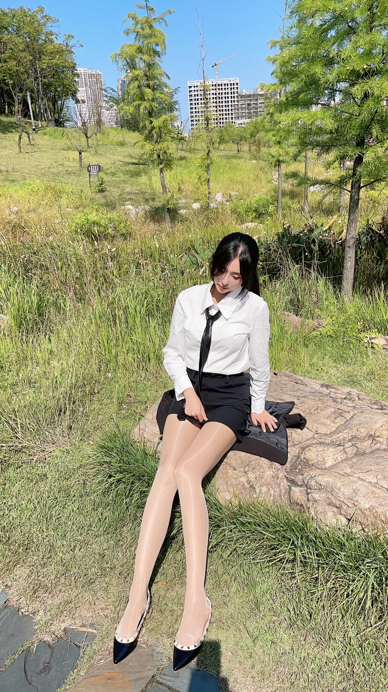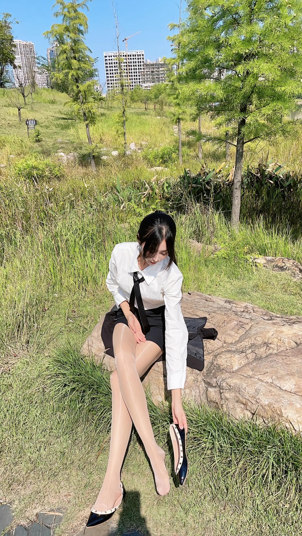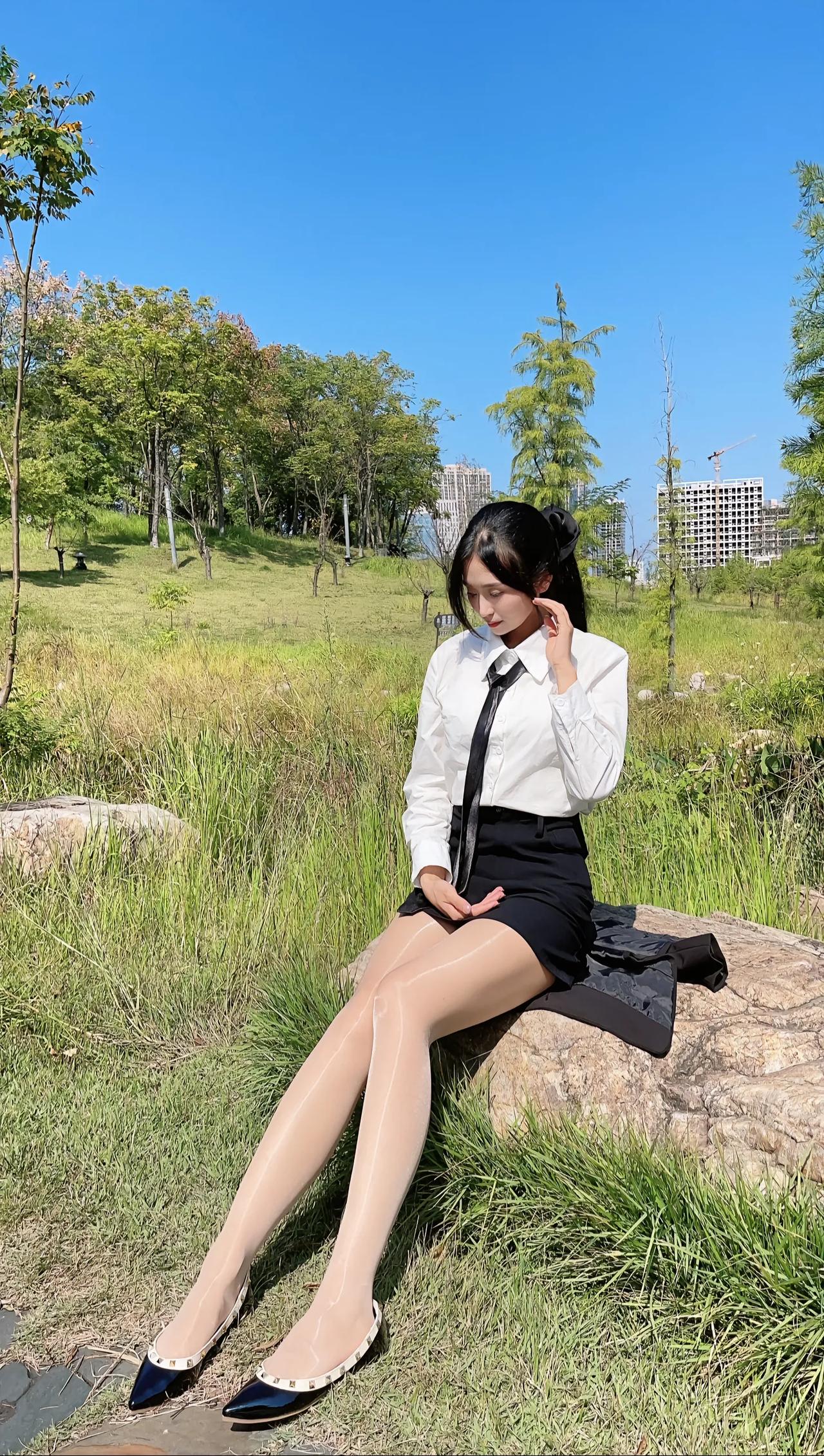 白衬衫黑短裙玩转出其不意的甜酷感!马油肉丝袜自带高清磨皮滤镜,细腻光感裹着腿型超吸睛,领带歪系解锁慵懒拽感~ 草地蓝天的清新背景撞碎沉闷,脱鞋踩草的小动作又野又媚,职场混搭甜酷风,回头率直接炸街✨
