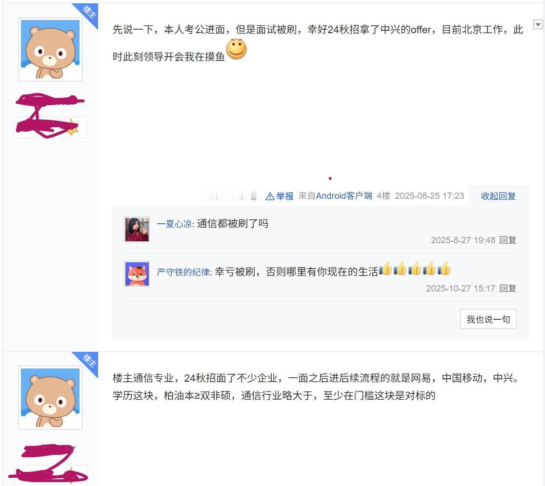 一电一邮的两名211本科毕业生用亲身经历来告诉你,本科就业与考研,该怎么选择? 先说结果。来自北京邮电大学、西安电子科技大学的两名25届本科毕业生,都选择了就业。其中通信专业的毕业生拿到了中兴(北京)工作,17K;计算机类专业的毕业生获得了华为分出来有国资背景的新凯来(深圳)的offer,薪资为20k。 本科毕业生能获得如此offer,是不是都挺令人羡慕的,是啊!你知道他们各有各的“绝招”。通信专业的,本科期间曾获得过挑战杯竞赛金奖,计设大赛还获得过国三;计算机类专业的,曾经有过暑期华为实习经历。 此外,他们还不约而同地提到以下几点经验。 1、本科毕业生就业面不宽,仅限部分非常吃学历的“学历厂”,比如华为、中兴、联洲等,这些单位对院校层次要求较高,比如华为至少在宣讲院校范围内。对于毕业后要想进体制内(包括考公)、国企,或科研院所等单位工作的,最好考研,因为他们的岗位要求至少在硕士以上,而且对院校也有要求。 2、本科毕业生获得技术岗的机会很少,仅限计算机类专业,目前Java前端很吃香,且待遇也不错。 3、本科毕业生就业最好选择在秋招,春招机会少;就业不仅要看一点运气,而且还要有拿得出手的东西,比如竞赛获奖经历、项目实习经历等。这都要求提前规划,做好相关的准备。 能够看到这的,大概都知道了该选择就业还是考研。近些年来,本科毕业生升学仍是主旋律,虽然今年研考的报名人数减少了45万,但基数仍有343万之巨,减少的只是挤出了水分而已。