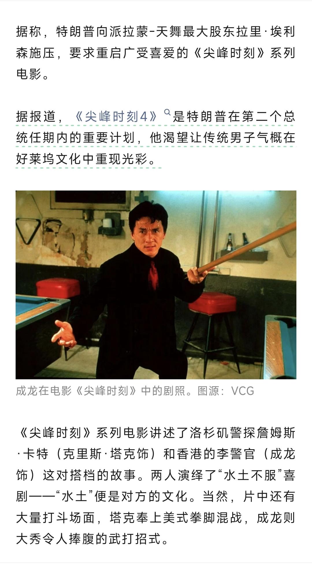 美媒称派拉蒙公司将发行电影《尖峰时刻4》,成龙和克里斯·塔克据称将回归出演。 成龙大哥也太拼了吧 70多岁了还在拍电影 记得小时候就在看他的录像带了 香港艺人都好拼啊哈哈 白娘子和许仙也都60多了吧 还在内地参加各种综艺节目 70岁正是拼的年纪 成龙国际地位