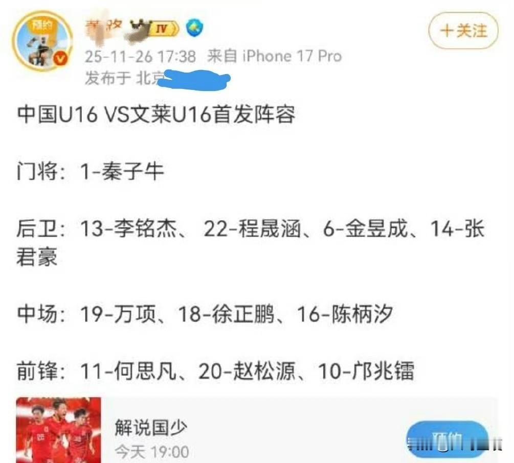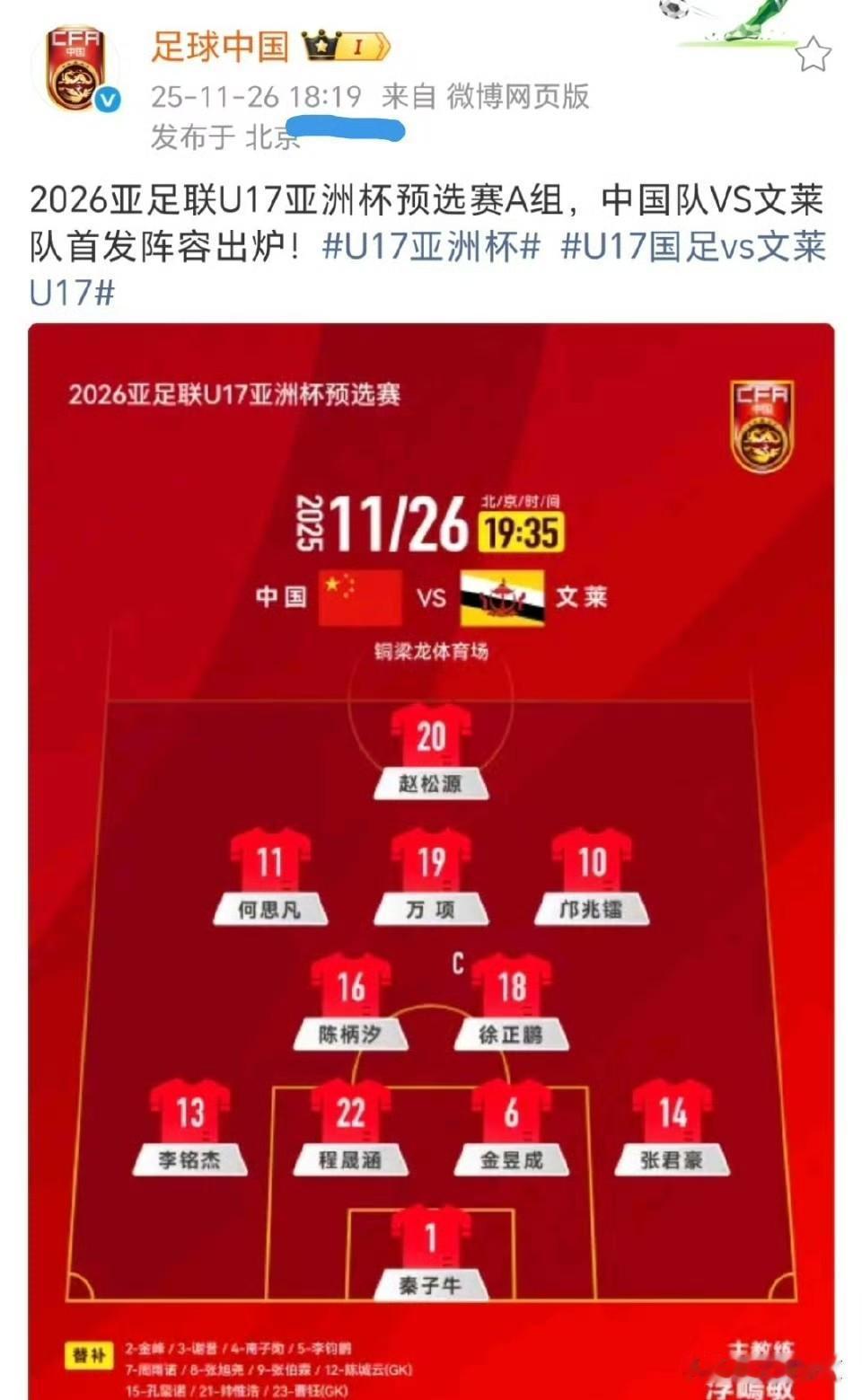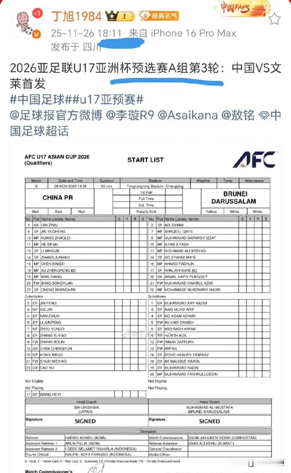 U16国少队首发阵容再出“泄密”事件!到底谁是内鬼?!到底谁在内勾外联?![发怒] 北京时间11月26日,U17亚洲杯预选赛第三轮,U17国少队将对阵文莱U16队[努力] 但赛前两个多小时,就有多个自媒体人提前“泄密”发布了本场比赛的首发阵容: 【图一】:自媒体【稀盐酸青训频道】的发布时间为17:21 【图二】:自媒体人【董路】的发布时间为17:38 而《足球报》外派的记者丁旭,在北京时间18:11,才第一时间发布了本场比赛的首发阵容【图三】[吃瓜群众] 而作为国字号球队的赛事信息发布方,《足球中国》则是在18:19,发布了本场比赛的首发阵容【图四】[吃瓜群众] 众所周知,根据亚足联此前修改后的相关规定,亚洲杯预选赛每场比赛的首发名单,通常在开赛前90分钟提交,这一规定适用于2023年亚洲杯及后续赛事[灵光一闪] 从时间轴可以反推出,U16国足本场比赛开始时间在19:35,如果提前90分钟提交首发阵容,那么媒体收到消息就是在18点以后,这也就对上了《足球报》记者丁旭的发布时间18:11,以及《足球中国》的发布时间18:19[666] 但为何自媒体“稀盐酸青训频道“和董路会提前拿到首发阵容,并分别于17:21和17:38发布了消息,这一时间均早于U16国少队提交首发阵容的时间[吃瓜群众] 因此,广大球迷有充分的理由怀疑,U16国少队球员、教练团队或者其他工作人员当中,有人提前泄密,将U16国少队的首发阵容透露给自媒体人,当然,也不排除将首发阵容提前透露给了菠菜公司[恐惧] 事实上,这已经不是U16国少队出现“泄密”事件,球员伤病和首发名单多次被自媒体提前发出,甚至一度干扰到U16国少队的正常备战[流泪] 那么,问题来了!到底谁是U16国少队中的内鬼?到底谁在内勾外联,私下透露球队信息?! 恳请中国足协和U16国少队教练团队,高度重视“泄密”事件,一查到底,揪出队中的内鬼,还U16国少队一片安静的备战氛围[祈祷]
