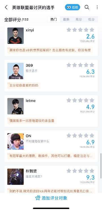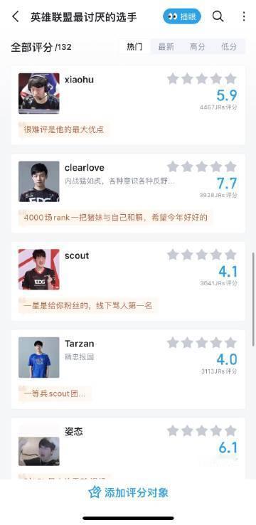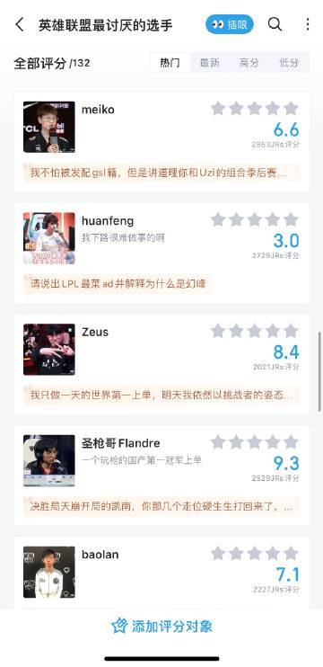 盘点英雄联盟最讨厌的选手,哪个低了,哪个高了?1、RNG Boss 2.5分网友:不能再低了吗?2、xinyi 2.6分网友:原来你也是s9的世界冠军吗?怎么猫也有皮肤,你没有捏3、Doinb 2.8分网友:集虚伪、嫉妒、傲慢于一身的职业选手(据说头盔事件之前9.0分)4、clid 2.9分网友:你的盲僧有说法我认可 但是人品不认可4、TBQ淘宝权3.0分网友:我不用担心房贷车贷了 你们呢?5、huanfeng 3.0分网友:请说出LPL最菜ad并解释为什么是幻峰滔搏官宣JackeyLove续约 英雄联盟s15 英雄联盟