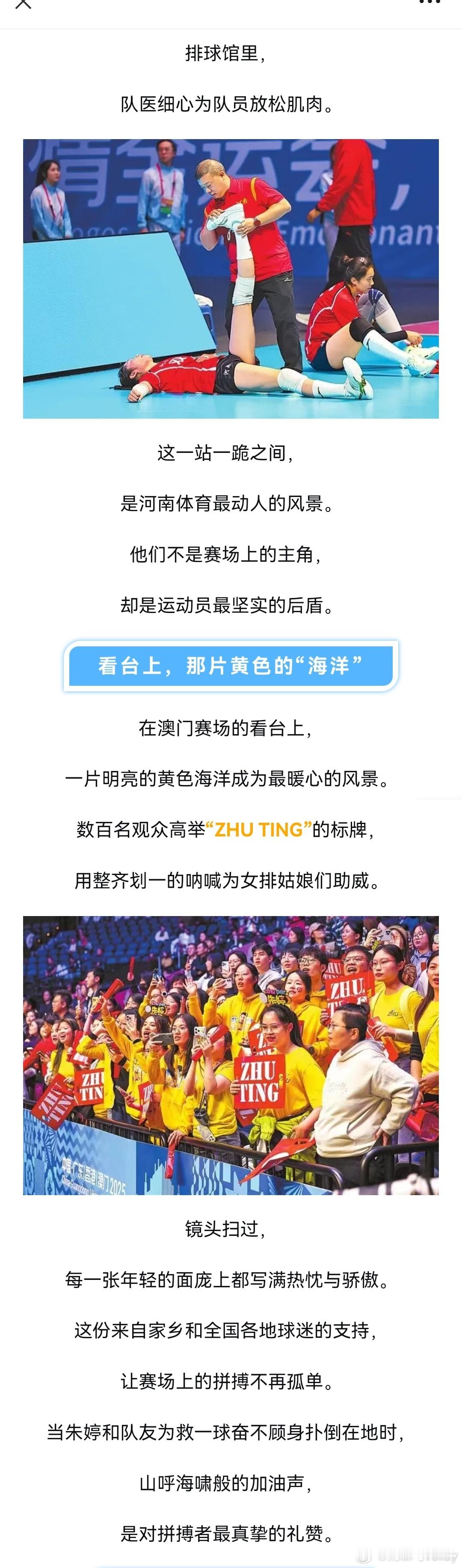 【河南体育局回望十五运丨镜头之下:泪与汗的勋章,光与影的赞歌】文中专门提到了小黄人,并附上了队医在给朱婷进行肌肉放松和小黄人在看台上↑呐喊加油的图片。文章说:在澳门赛场的看台上,一片明亮的黄色海洋成为最暖心的风景。数百名观众高举“ZHU TING”的标牌,用整齐划一的呐喊为女排姑娘们助威。镜头扫过,每一张年轻的面庞上都写满热忱与骄傲。这份来自家乡和全国各地球迷的支持,让赛场上的拼搏不再孤单。当朱婷和队友为救一球奋不顾身扑倒在地时,山呼海啸般的加油声,是对拼搏者最真挚的礼赞。全文链接:网页链接朱婷第十五届全运会