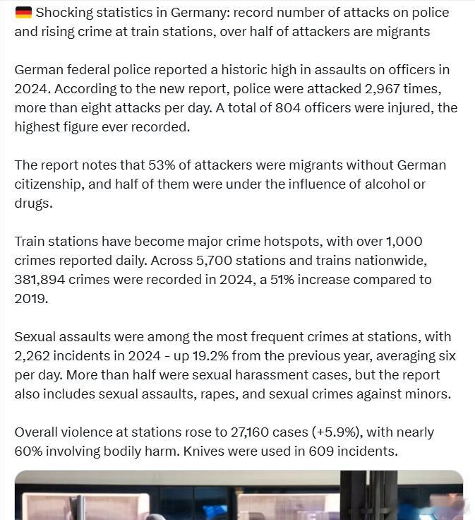 德国已成为犯罪的天堂2024年针对警察的袭击创历史新高,火车站犯罪激增,超一半袭击者为移民。德国联邦警察报告称,2024年针对警察的暴力袭击次数达到历史最高:共计2967起,平均每天超过8起。有804名警察在袭击中受伤,这是历来最高数字。报告指出,53%的袭击者为没有德国国籍的移民,其中一半袭击者在案发时处于酒精或毒品影响之下。火车站已成为犯罪重灾区,全国平均每天报告超过1000起犯罪案件。2024年,在全国5700个火车站及列车上共记录了381894起犯罪案件,比2019年激增51%。性犯罪是火车站最常见的犯罪类型之一:2024年共发生2262起性侵案件,较前一年上升19.2%,平均每天6起。其中过半为性骚扰,但也包括性侵犯、强奸及针对未成年人的性犯罪。火车站整体暴力案件上升至27160起(+5.9%),近60%涉及人身伤害。共有609起案件中使用刀具。