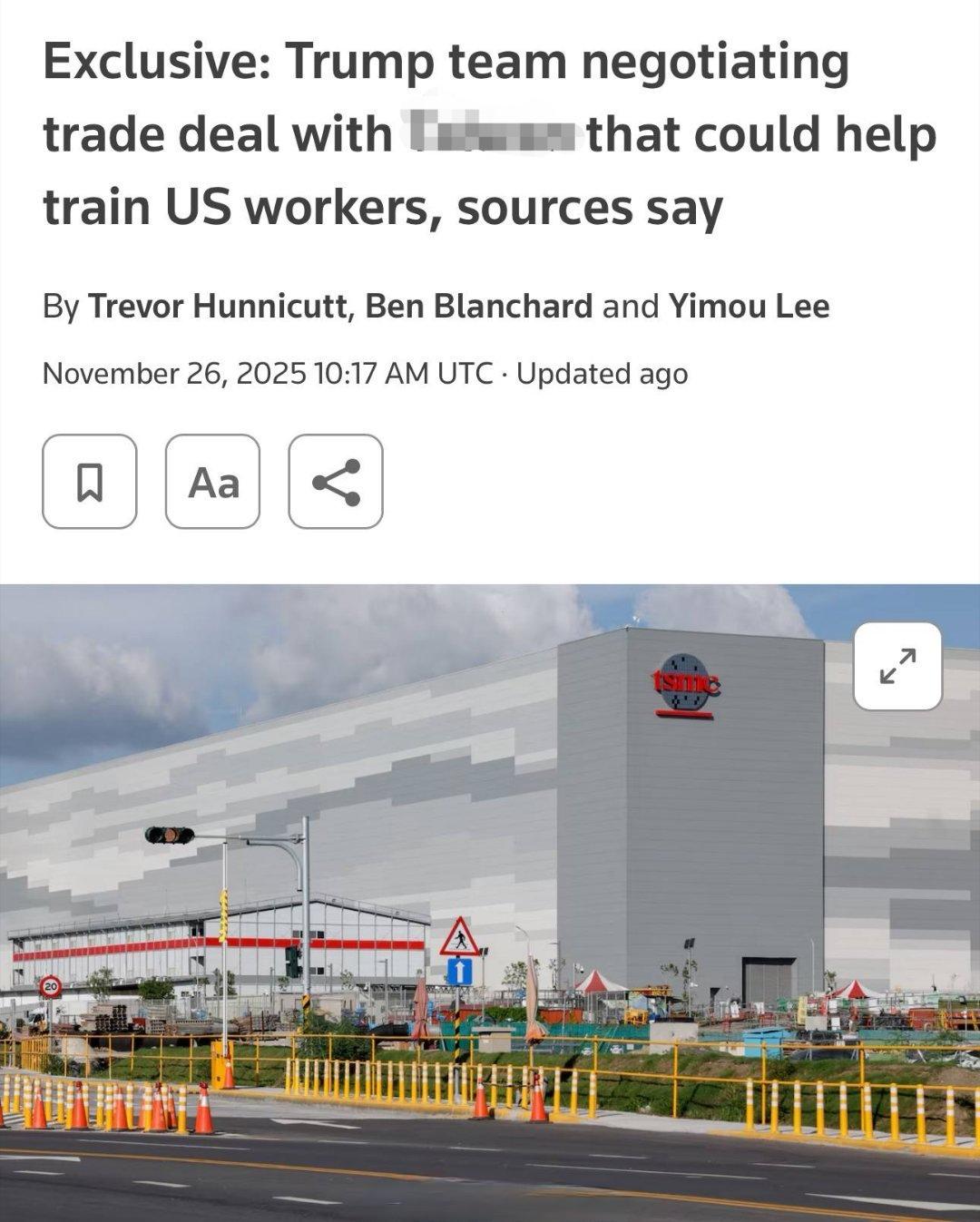 据路透社报道,美国政府正与🐸,特别是🐸积电,商讨一项协议,以增加对美国芯片生产的投资并帮助培训美国工人。 ➡️🐸积电已经向其美国业务投入了1650亿美元。 ➡️🐸承诺的新投资总额预计将低于其他地区竞争对手的出价,同时还将包括🐸协助开发美国科技园区基础设施。 ➡️作为交换,🐸寻求降低目前面临的20%美国关税。