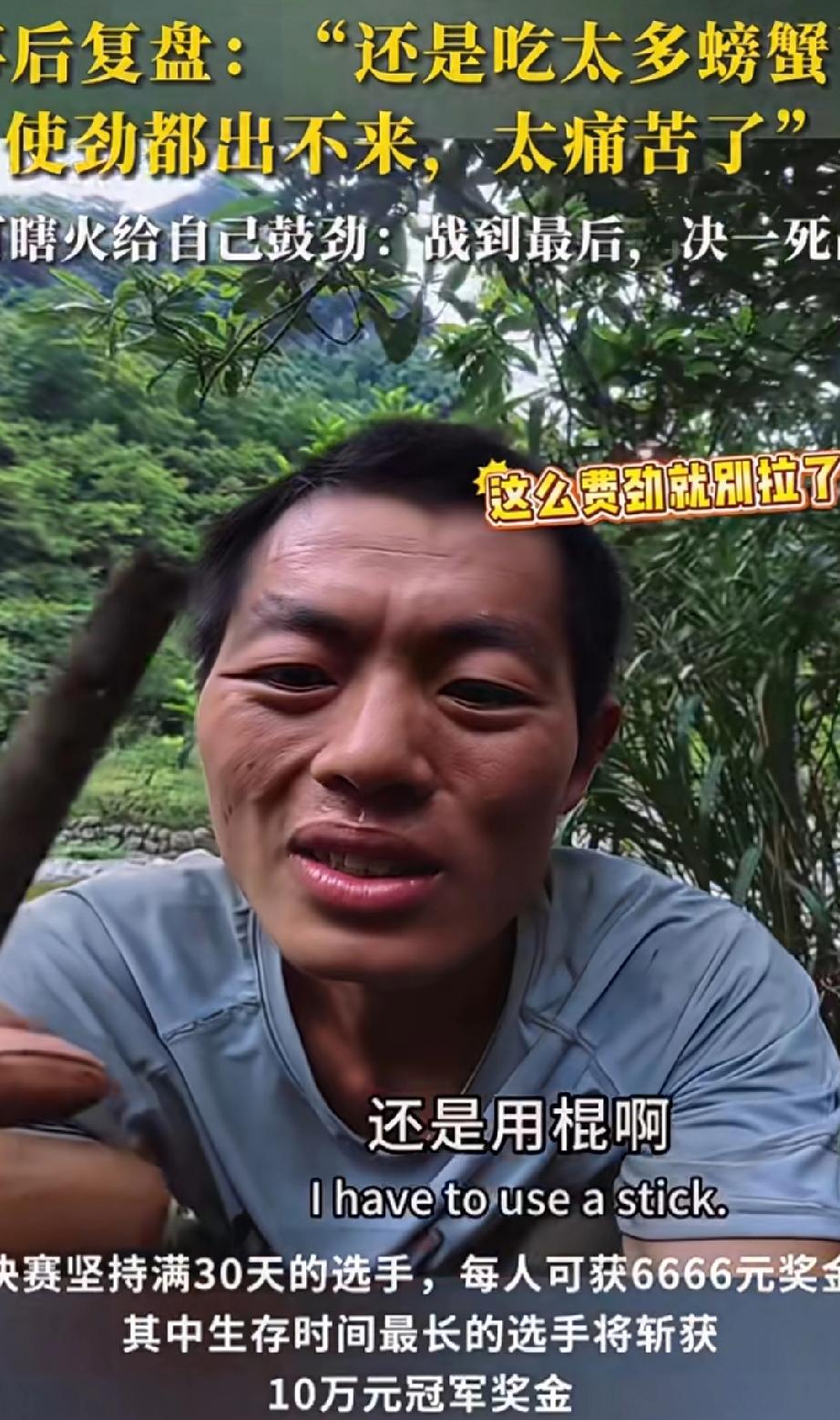 大力在线拉屎,拿着一根棍子痛苦的说“还是得用棍子”,后续实在拉不出来,还是用这根棍子抠了出来。 这个世界真的是太魔幻了,居然看到了别人直播拉屎,痛苦的脸都扭曲了。相信有过便秘的人,一定能共情这种痛苦吧! 最近刀疤哥他们的决赛地点换到了山下,没有虫虫了,也没有鼠鼠了,山药和猕猴桃都找不到。刀疤哥都愁的慌,不知道该吃啥了,只能在小溪流里摸点螃蟹吃,而王大力便秘的主要原因是因为吃的太多的螃蟹导致的,希望刀疤哥不会遭受和王大力一样的痛苦。