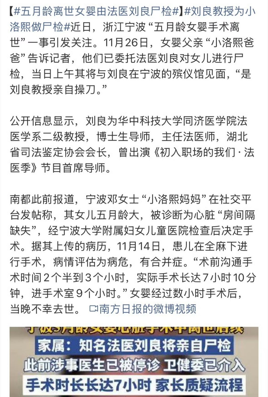 五月龄离世女婴由法医刘良尸检 尸检才是真正解决问题的正途,可以知道婴儿到底因为什么而死亡,可以看出医院和医生有没有责任?既然是死者家属请来的法医,如果是有相应资格证的,那得出的结果需要法院认定。就看这个法医能不能坚守自己的职业良知,给出的结论是不是能够经得起实践的检验。