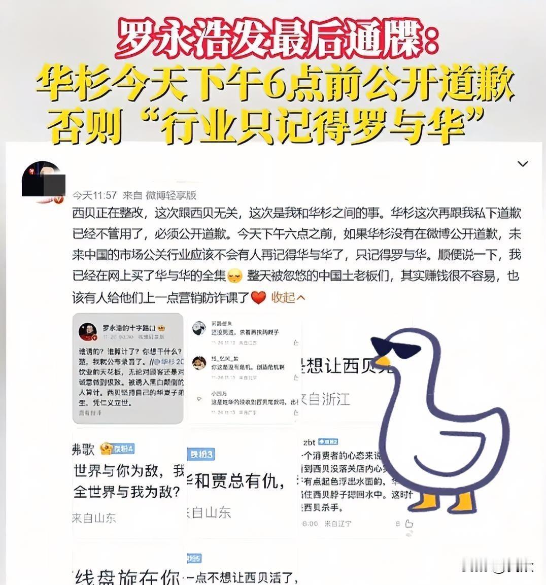 家人们谁懂啊!罗永浩给华与华创始人华杉下的“18点公开道歉”通牒已超时10分钟,全网蹲守却等来零回应——华杉微博还直接开启“一键防护”,禁关注、关评论,这波沉默直接把热度推上顶峰! 事件起因超简单:华杉近期力挺西贝时,暗指罗永浩“被算计”,戳中老罗底线。向来敢刚的罗永浩当即放狠话:18点前不公开道歉,就公布录音,还要开“营销防诈课”质疑华与华专业度,火药味拉满。 数据说话!11月25日中午至26日14时,事件舆情热度达19389,社交平台讨论量占比60.9%。评论区彻底沸腾:“华与华别怂,敢内涵就敢回应”“老罗说到做到啊,就等录音了”,还有网友追问:“预制菜透明度、营销伦理不该借着这事说道说道?” 其实大家追更不只是看瓜,80%网友期待公众人物遇争议能及时回应,背后是对透明度和诚意的渴求。有人支持老罗为消费者发声,也有人理性看待双方立场,更有人盼着事件能推动行业规范。 现在道歉没等到,评论区关了,罗永浩的录音会如期放出吗?这场争议还藏着多少内幕? 你觉得华与华为啥沉默?老罗录音里有猛料吗?评论区聊聊你的预判!