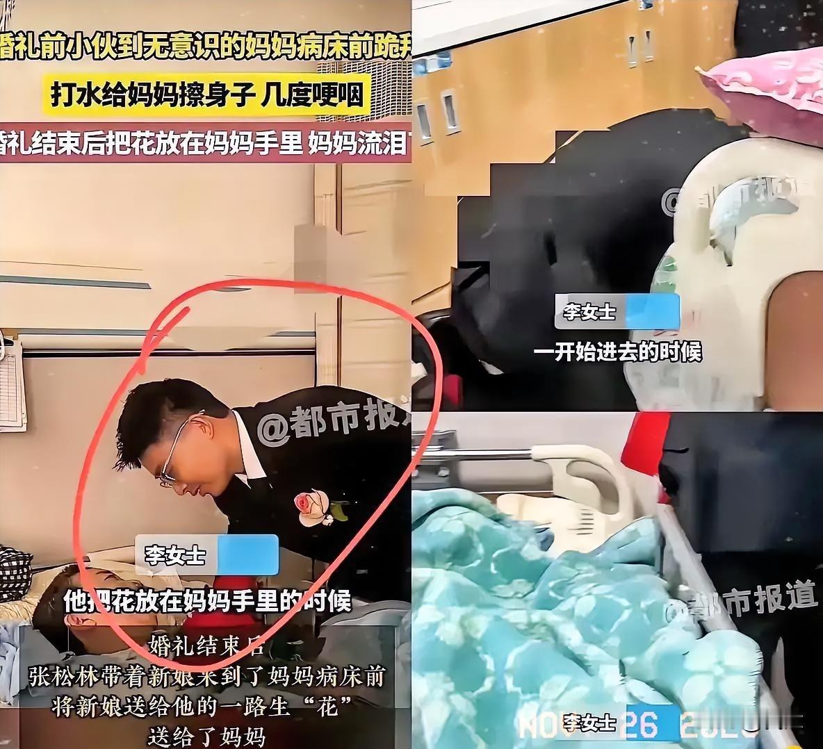 泪崩了! 河南一男子今天结婚,按理说,应该去接新娘,去酒店准备婚礼流程,可是他却没有这么做,而是开着车直奔医院。这名男子的妈妈前几年生了一场大病,一直都昏迷不醒,这名男子一直在家里照顾着妈妈,没能出外打工,这几年来,家里实在是太穷了,这名男子结婚的所有钱都是向亲戚朋友借的,他想着妈妈一直昏迷不醒,今天是他的大喜日子,说不定能把妈妈弄醒,让她看看自己结婚的样子,于是才有了今天的一幕。男子到了医院后,看到妈妈还是昏迷不醒,他就跪在地上,双手合十,放在妈妈面前,轻声说:“妈,我今天结婚啦,你看看我帅不帅?”这大概是他这几年来说的最有底气的一句话吧,谁不想在自己结婚的时候让父母看看自己帅不帅、漂亮不漂亮,可是这几年来,他一直都没有说过这句话,因为他一直都没有底气。说完这句话后,他就细心地给妈妈喂水喂饭,匆匆忙忙地去接新娘了。到了接新娘的时间,他也没有急,等了新娘化好妆出来后才去接。两人上了车,新娘也没有任何怨言,一路上还和他一起给婆婆说话。到了酒店后,也是两人一起给婆婆说话,两人一来一去,一点也看不出新娘和婆婆不是亲生母子俩。这一幕看得旁边的人都竖起了大拇指,说这男子真孝顺,这么好的儿子,让人怎么替他找媳妇都找不到,原来好媳妇都是让人挑剩下的!结婚不就是两个人的事吗?什么都要以人为主,可是这名男子却把婚礼办得如此温馨,让人感觉就像是在看一场专门为婆婆举办的慈善晚会一样。这就是孝心吧,不管到什么地方,孝心都是能得到别人的认可和尊重的。孝心也能让别人觉得你家教良好,让人愿意和你交往、交朋友、做生意等。这就是人们常说的“德行天下”吧,不管你有什么本事,只要你有德行、有孝心,让人感觉舒服的,就算你没有本事,人家也愿意帮你、照顾你。婚礼,不仅仅是两个年轻人的事,更是两个家庭的事,你说呢?