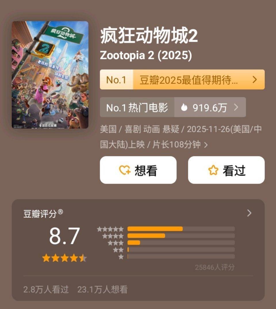 疯狂动物城2豆瓣开分8.7,很稳了!佳片奇遇季