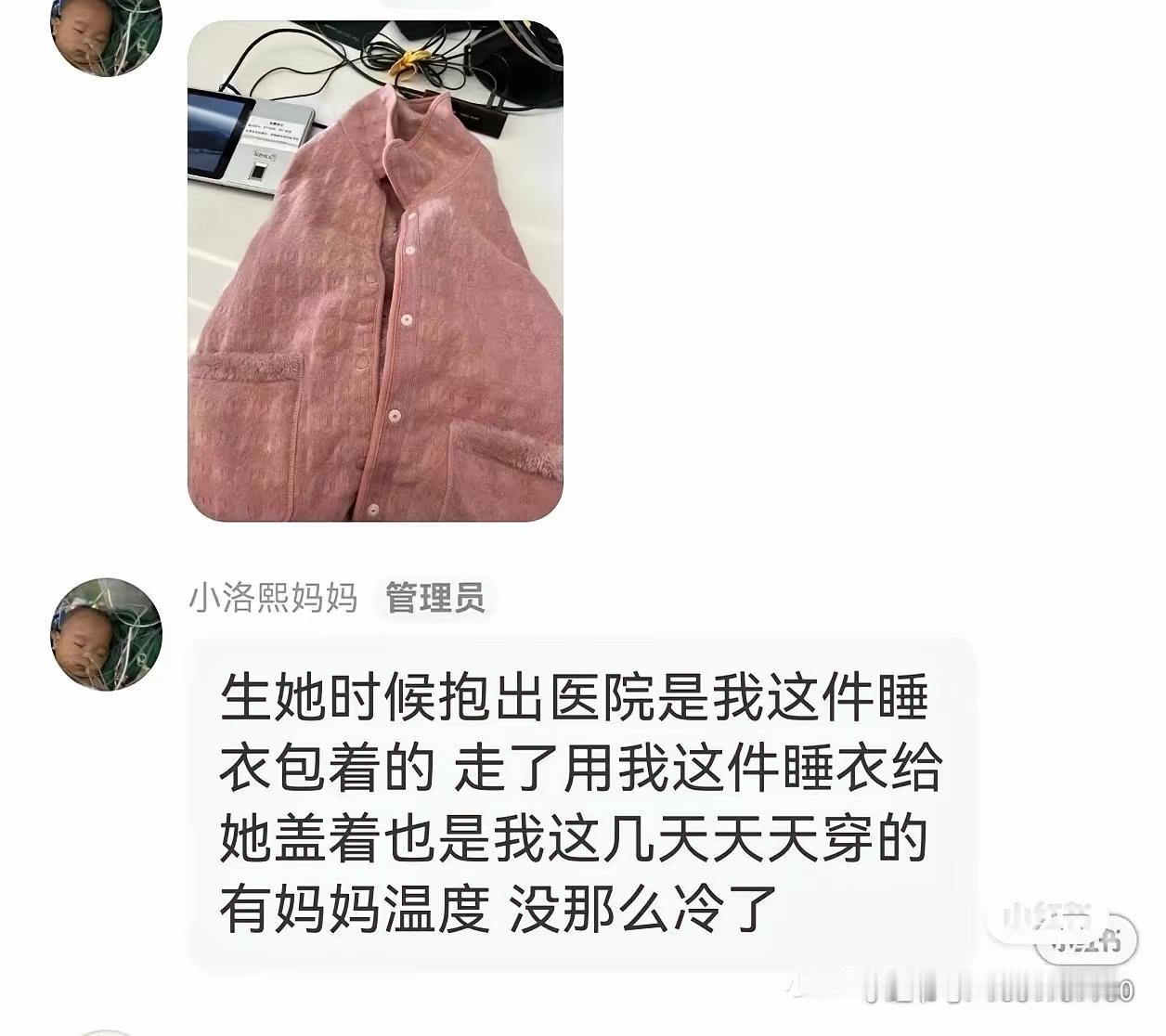 小洛希妈妈的这件衣服是一件有温度,有妈妈的味道的衣服,洛希出生时,妈妈用这件睡衣包着宝贝出院,临走的时候,还是这件睡衣给宝贝盖上,宝贝闻着妈妈的味道,也会觉得更加有安全感了,愿宝贝天堂里快乐无忧!