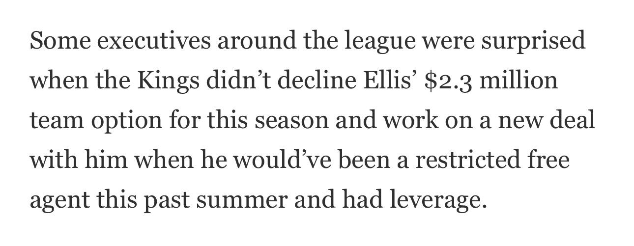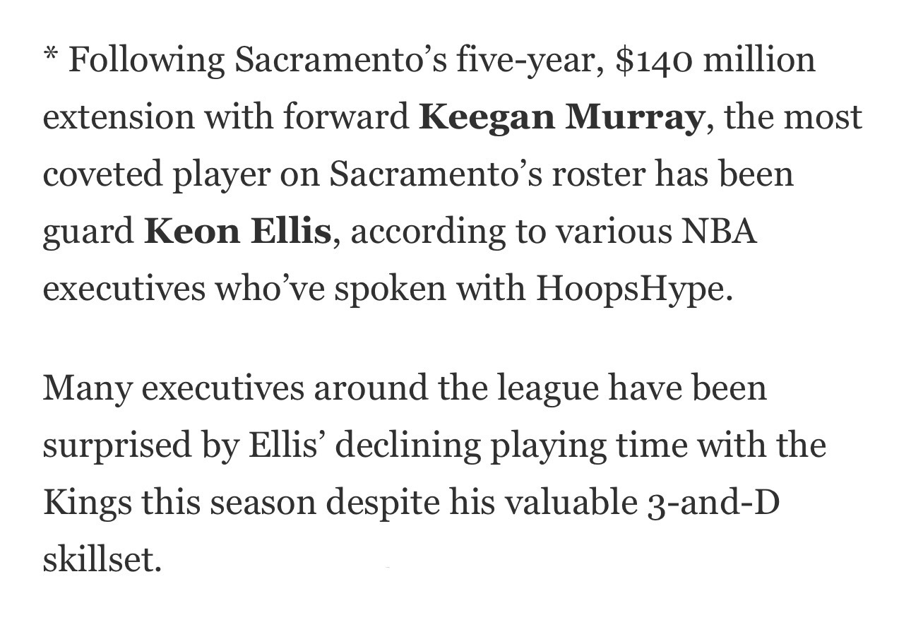 Scotto:“在国王与前锋基根·穆雷签下5年1.4亿美元的续约合同后,据多位联盟高管透露,国王阵容中最受外界追捧的球员变成了后卫基昂·埃利斯。不少高管都对埃利斯本赛季在国王的出场时间减少感到意外,尽管他是个很有价值的3D球员。今年休赛期,埃利斯本可以成为受限制自由球员,手握谈判筹码,但国王当时既没有拒绝他本赛季230万美元的球队选项,也没有与他商谈新合同。