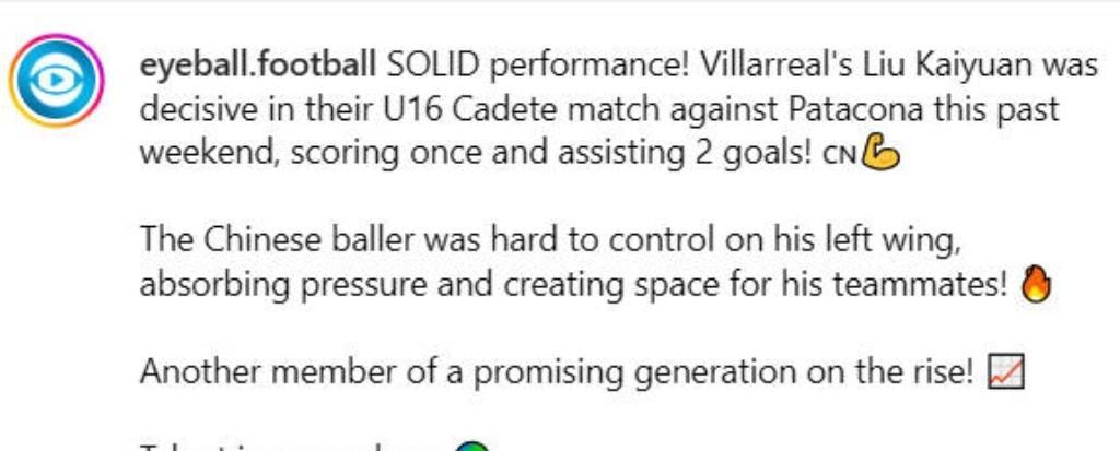 著名球探媒体《eyeball.football》继邝兆镭之后再次关注了另一名中国足球小将09/10球员刘凯源,更是晒出了他在上轮联赛里“一球两助攻”的表选,对于他在左边锋的位置上能吸引火力为队友创造空间的能力大加赞赏,他们认为年轻的中国球员正在快速成长!