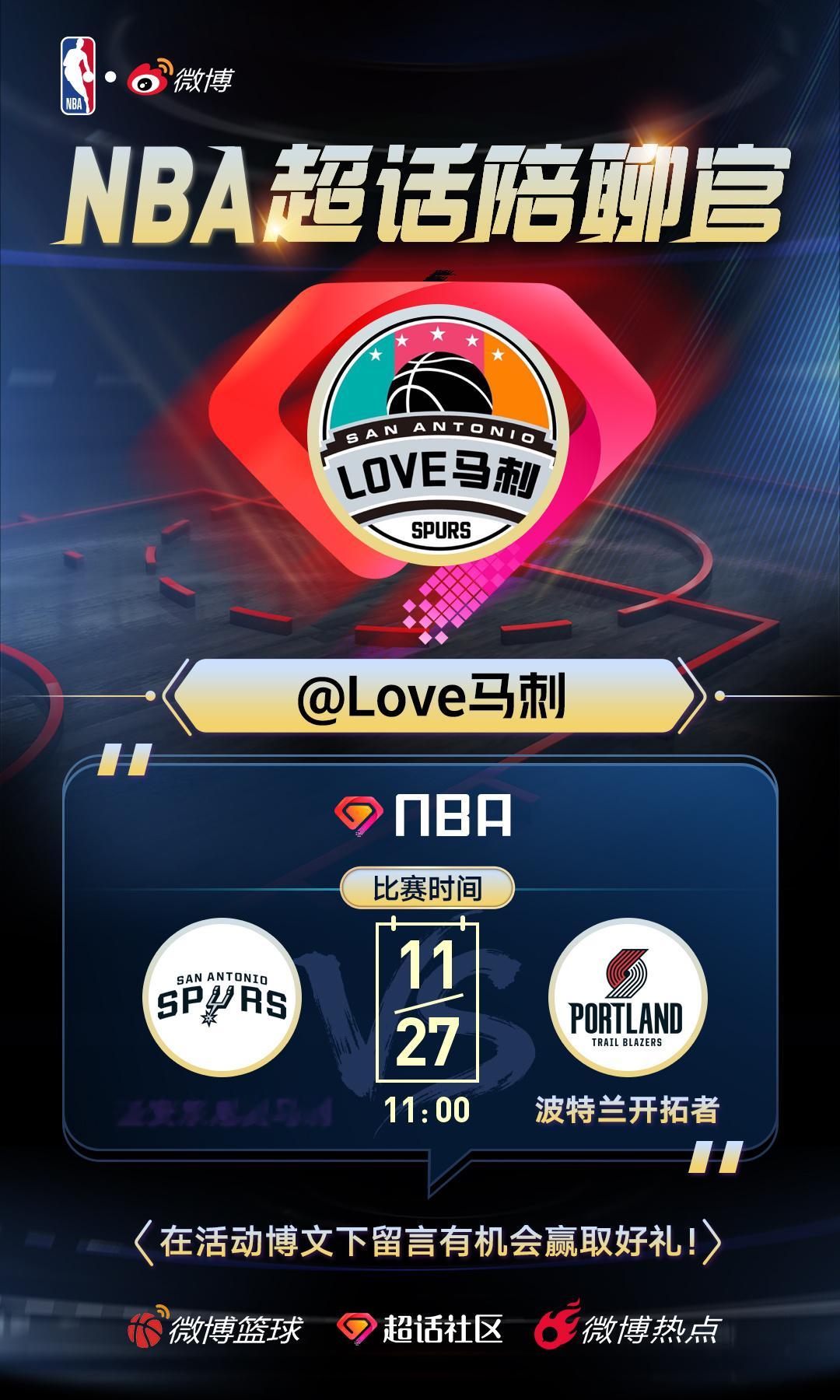 🎁感谢官方邀请,作为明日马刺vs开拓者比赛的陪聊官,欢迎大家踊跃发言!!明日上午11点,马刺将客场挑战开拓者!在文班亚马确认缺阵的情况下,这场青年军的对决无疑更具看点!此外,马刺旧将丹尼-格林将作为嘉宾解说本场比赛,他的“跨界”点评又会带来哪些惊喜?本场核心议题:1. 核心缺阵:文班亚马与卡斯尔皆不在阵中,你更期待哪位球员挺身而出,扛起攻防大旗?2. 战术展望:面对开拓者,你认为球队应该坚持快速转换,还是从内线寻找突破口?3.哈珀有概率复出,你觉得他会给马刺带来哪些不一样的改变?💬 互动有礼:欢迎在评论区畅所欲言,分享你的观赛感受、战术见解或是对球队的寄语!🎁 赛后将从评论区互动球迷中随机抽取一位,送上NBA官方周边一件!!NBA超话陪聊官马刺vs开拓者圣安东尼奥马刺 抽奖详情